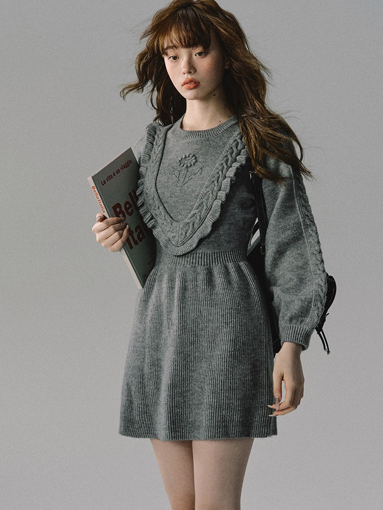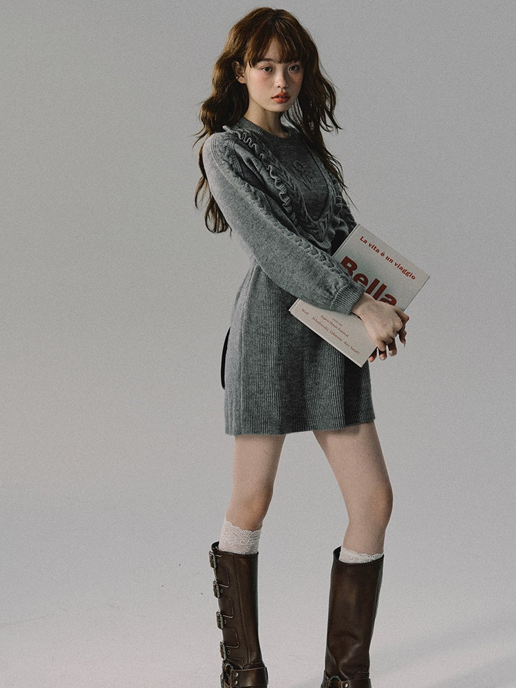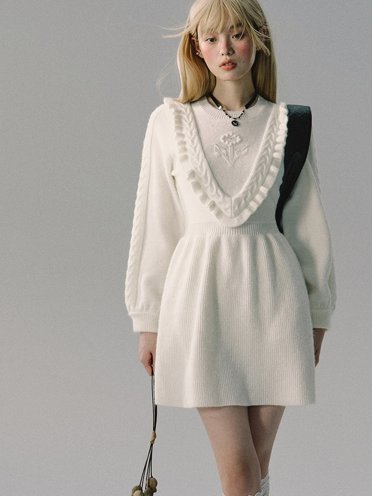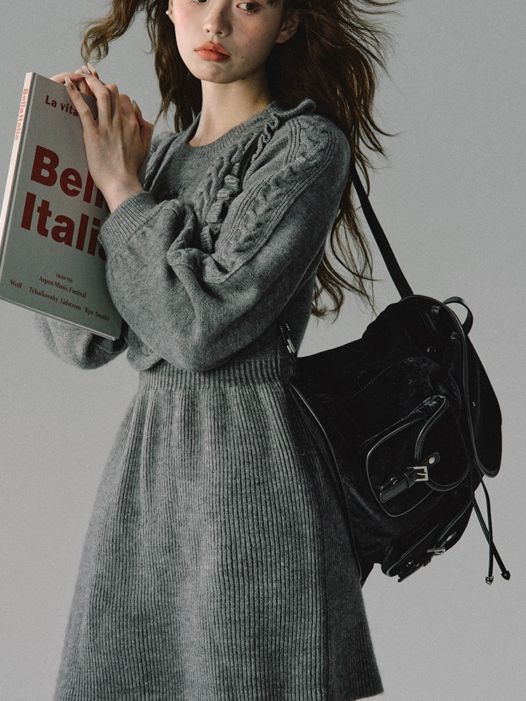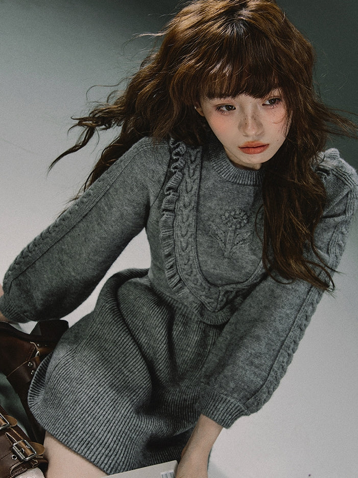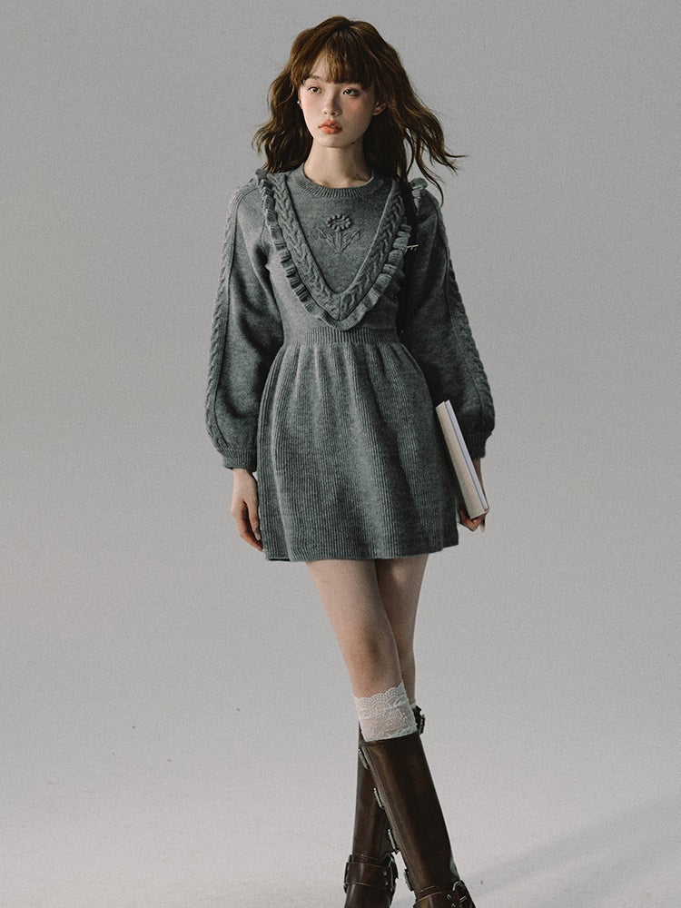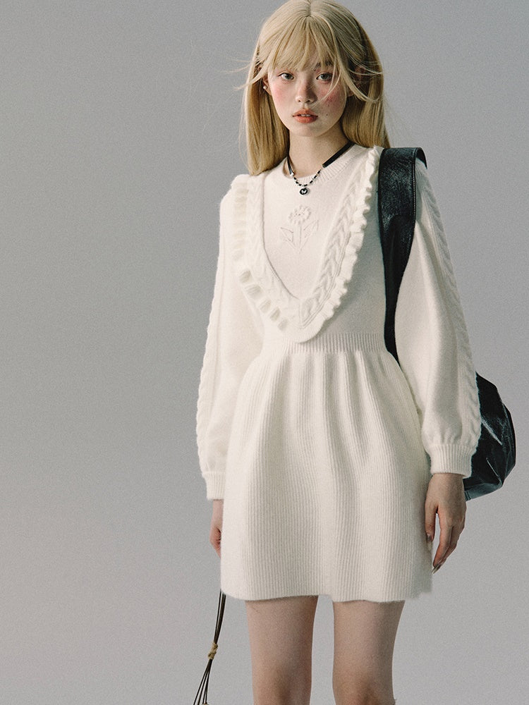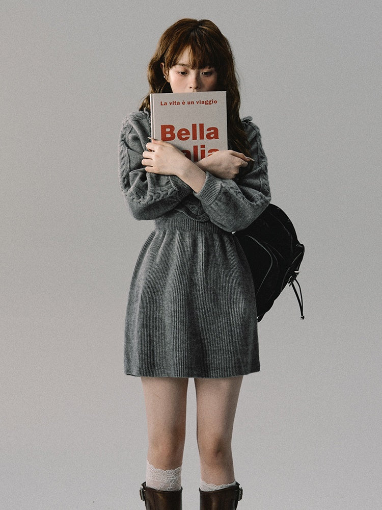 Knit Frill Retro Balloon-Sleeve One-Piece