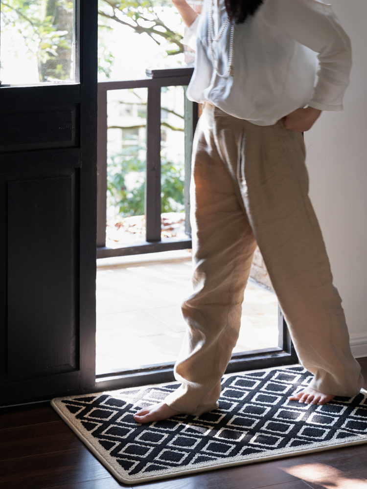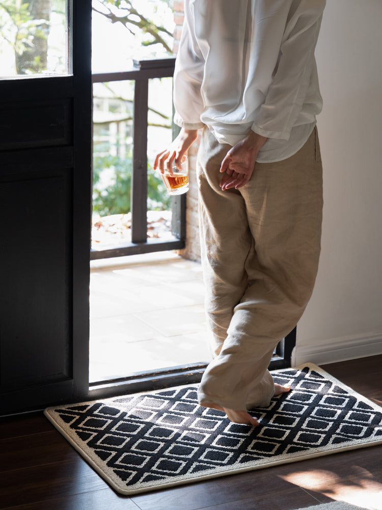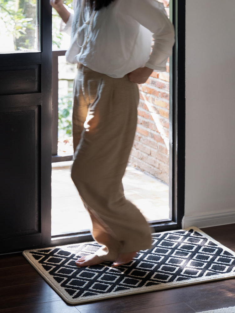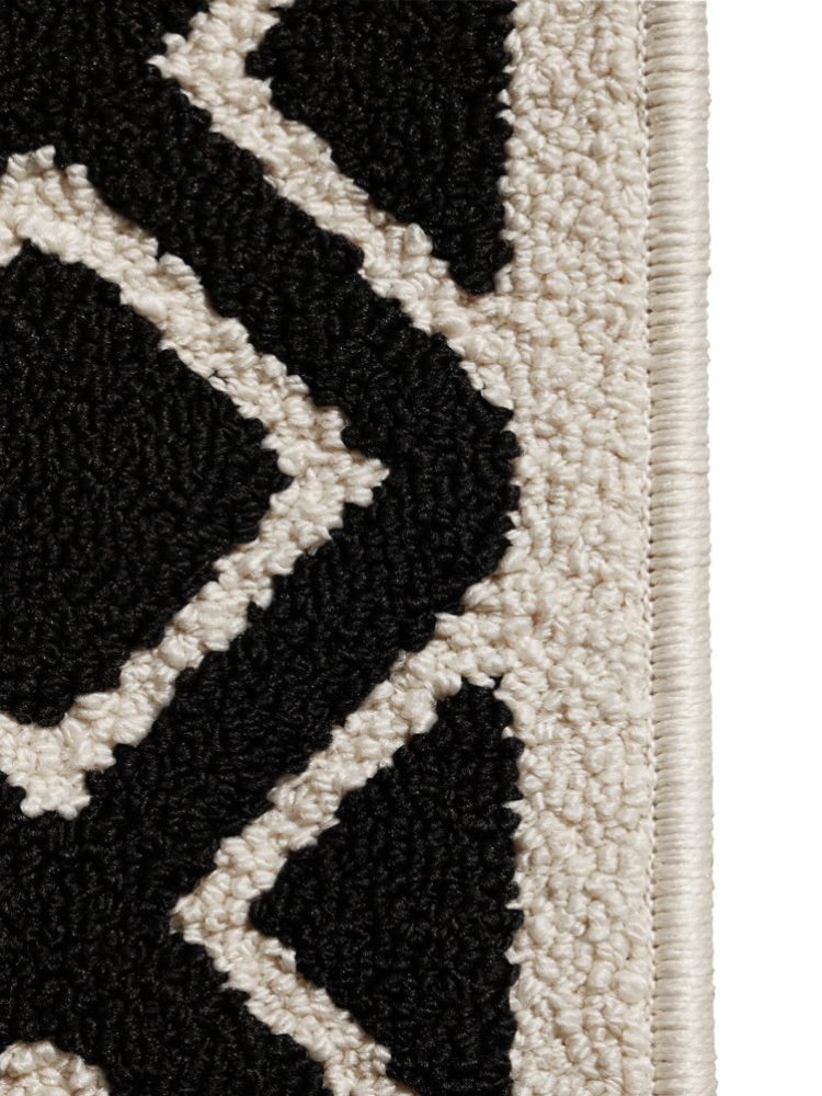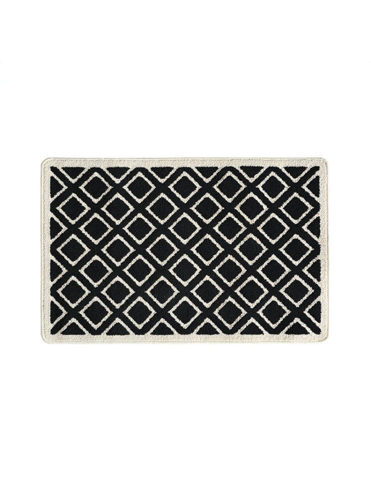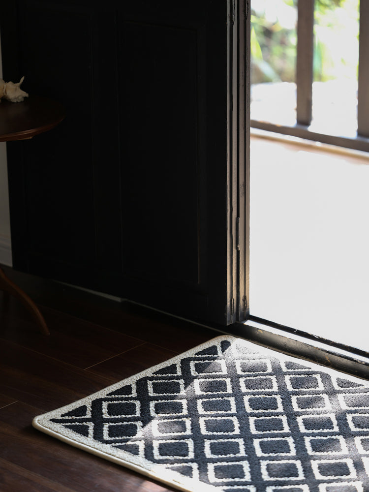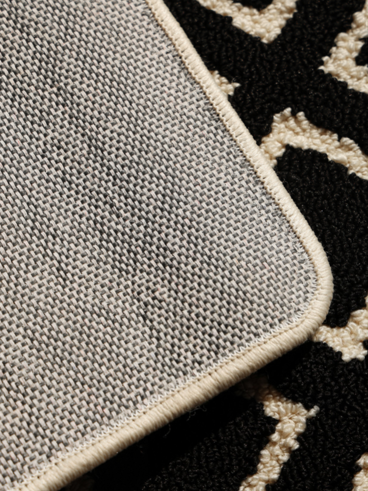 Presenting the London "Downing Tile" Embossed Mat - a blend of classic design with modern functionality. Featuring an intricate algal filigree pattern in a timeless black and white, this mat is perfect for entryways, bathrooms, or beside your bed. Made from a durable blended fabric, it offers mild waterproofing, ensuring longevity and ease of maintenance. With dimensions of 24 x 35 inches, this mat adds a touch of refined British elegance to any space.