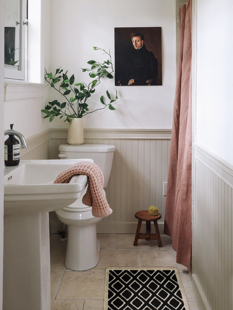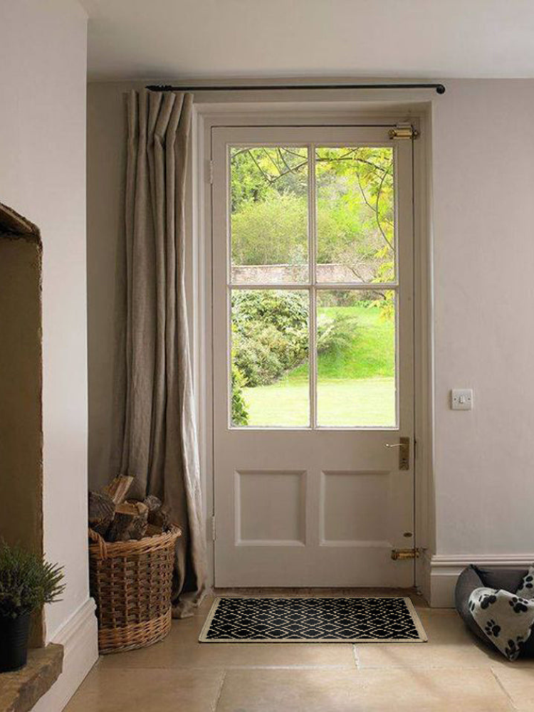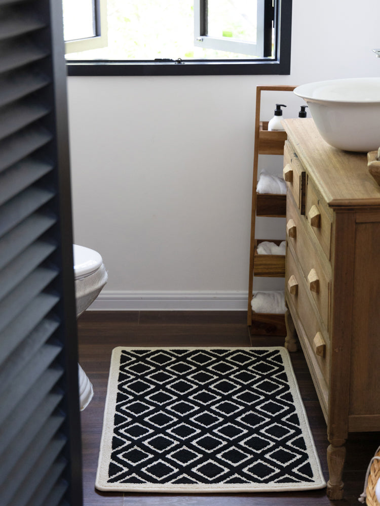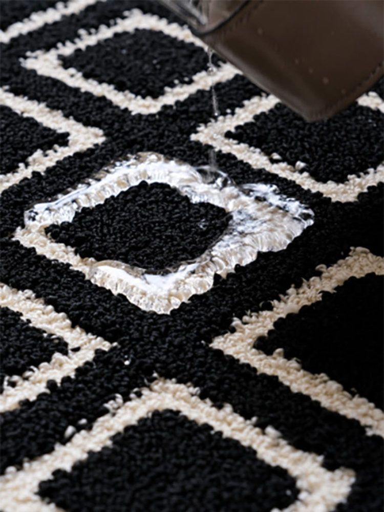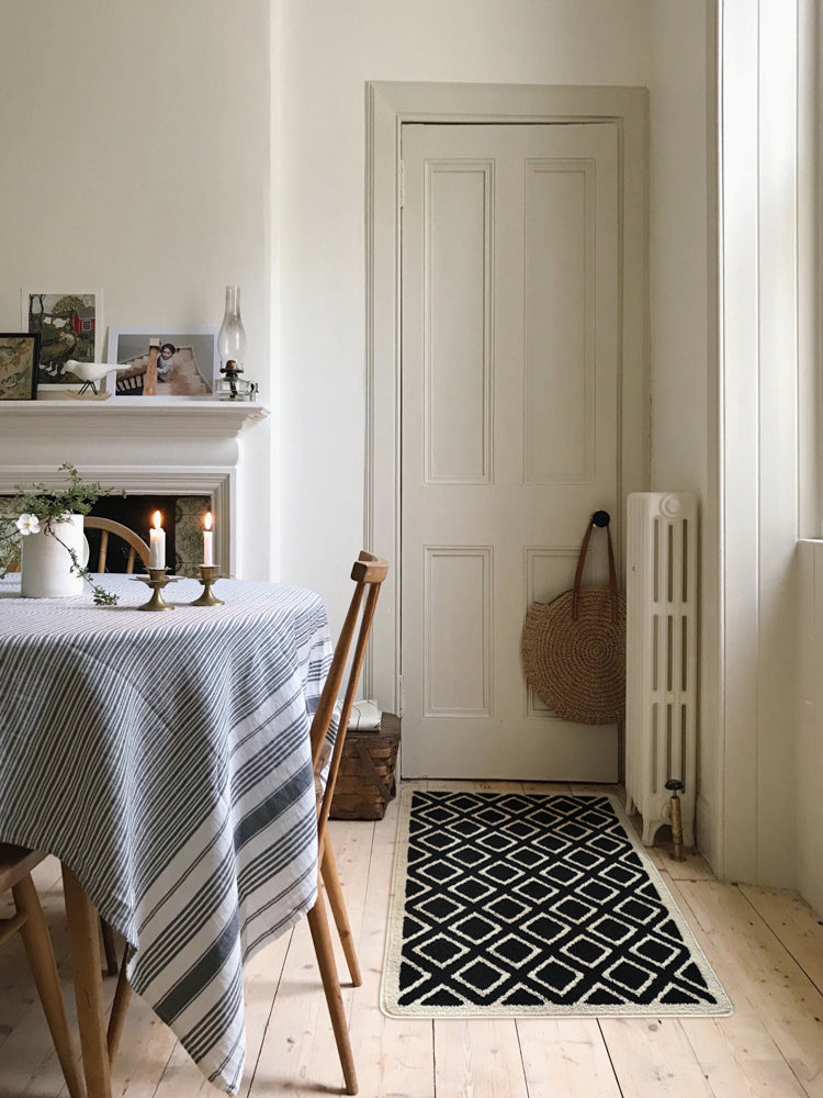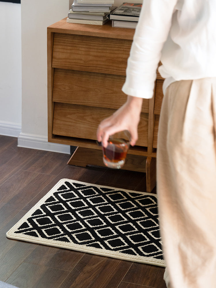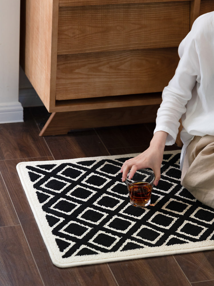 Presenting the London "Downing Tile" Embossed Mat - a blend of classic design with modern functionality. Featuring an intricate algal filigree pattern in a timeless black and white, this mat is perfect for entryways, bathrooms, or beside your bed. Made from a durable blended fabric, it offers mild waterproofing, ensuring longevity and ease of maintenance. With dimensions of 24 x 35 inches, this mat adds a touch of refined British elegance to any space.