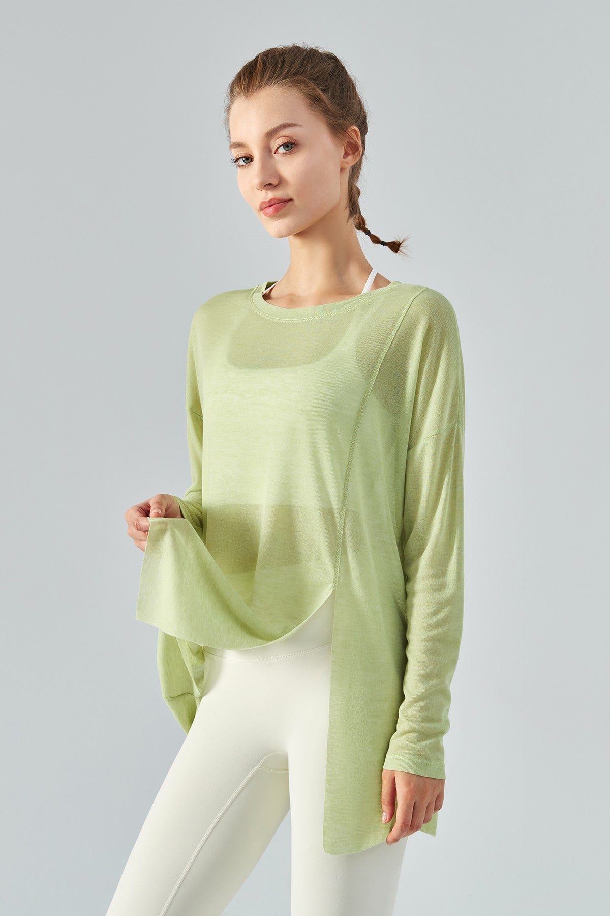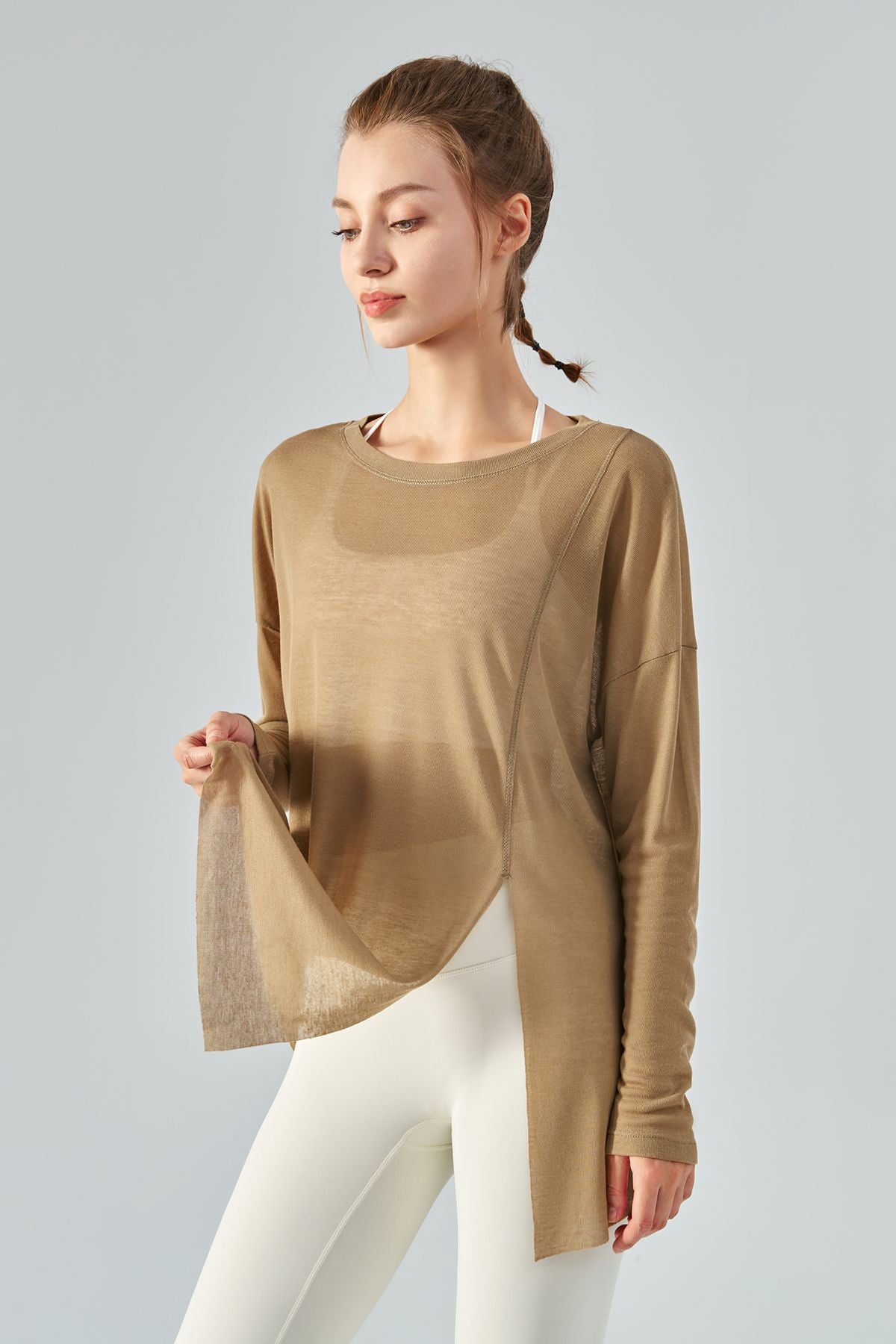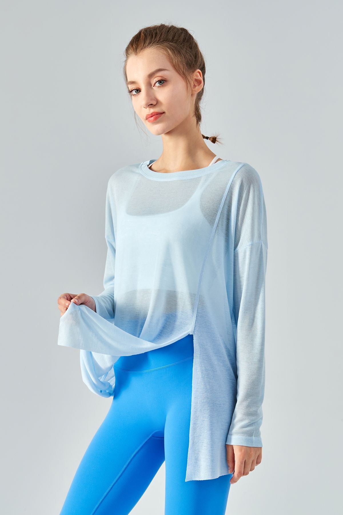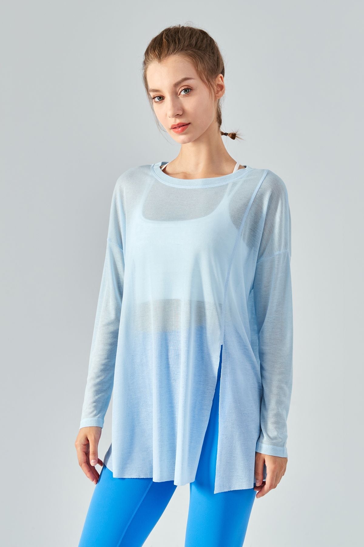 Featuring a sheer mesh fabric with a long sleeve and asymmetrical hem design, style this with strappy sports bra and workout leggings to complete the look.