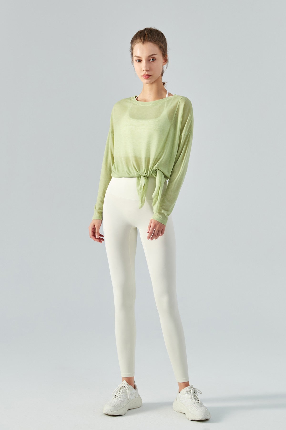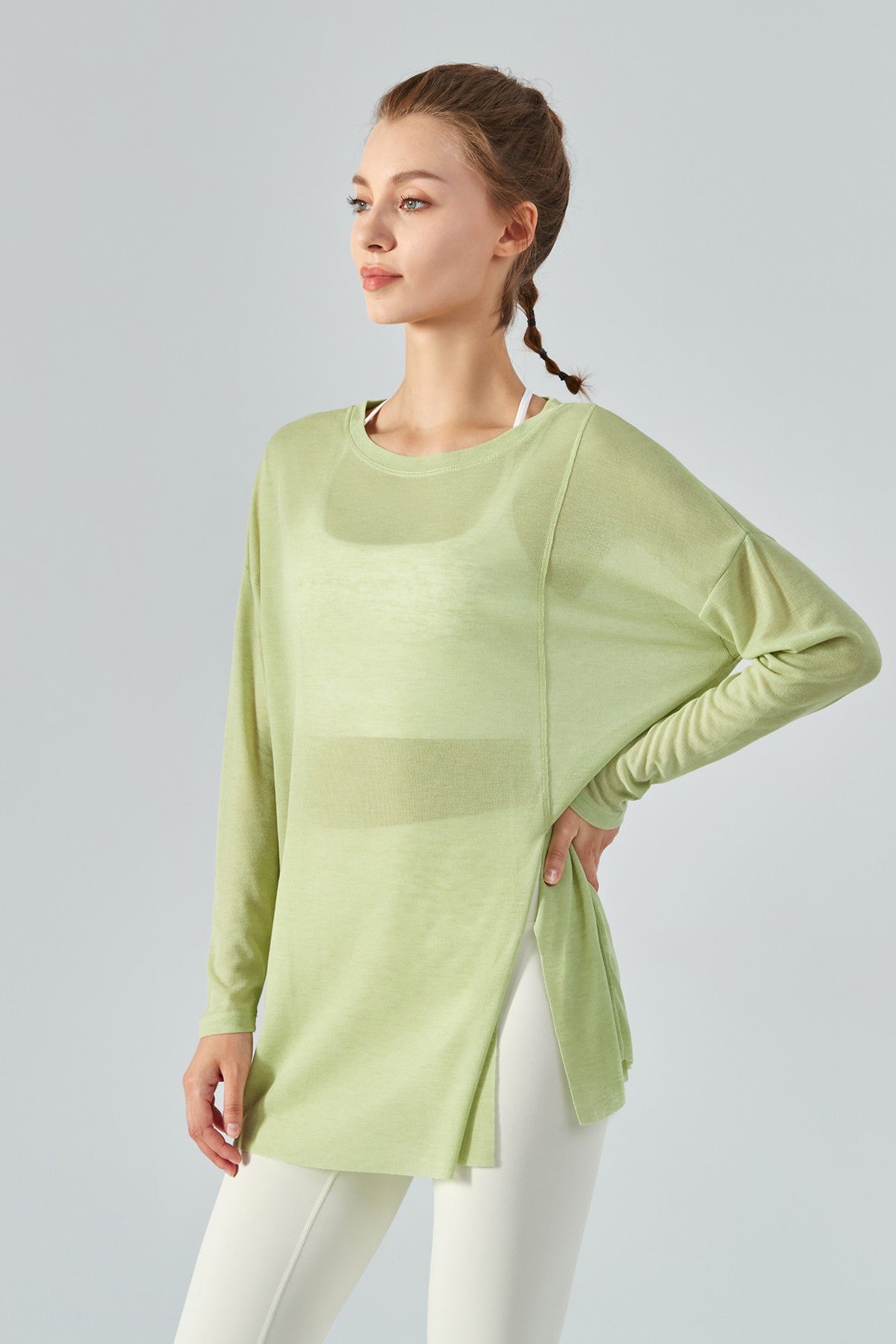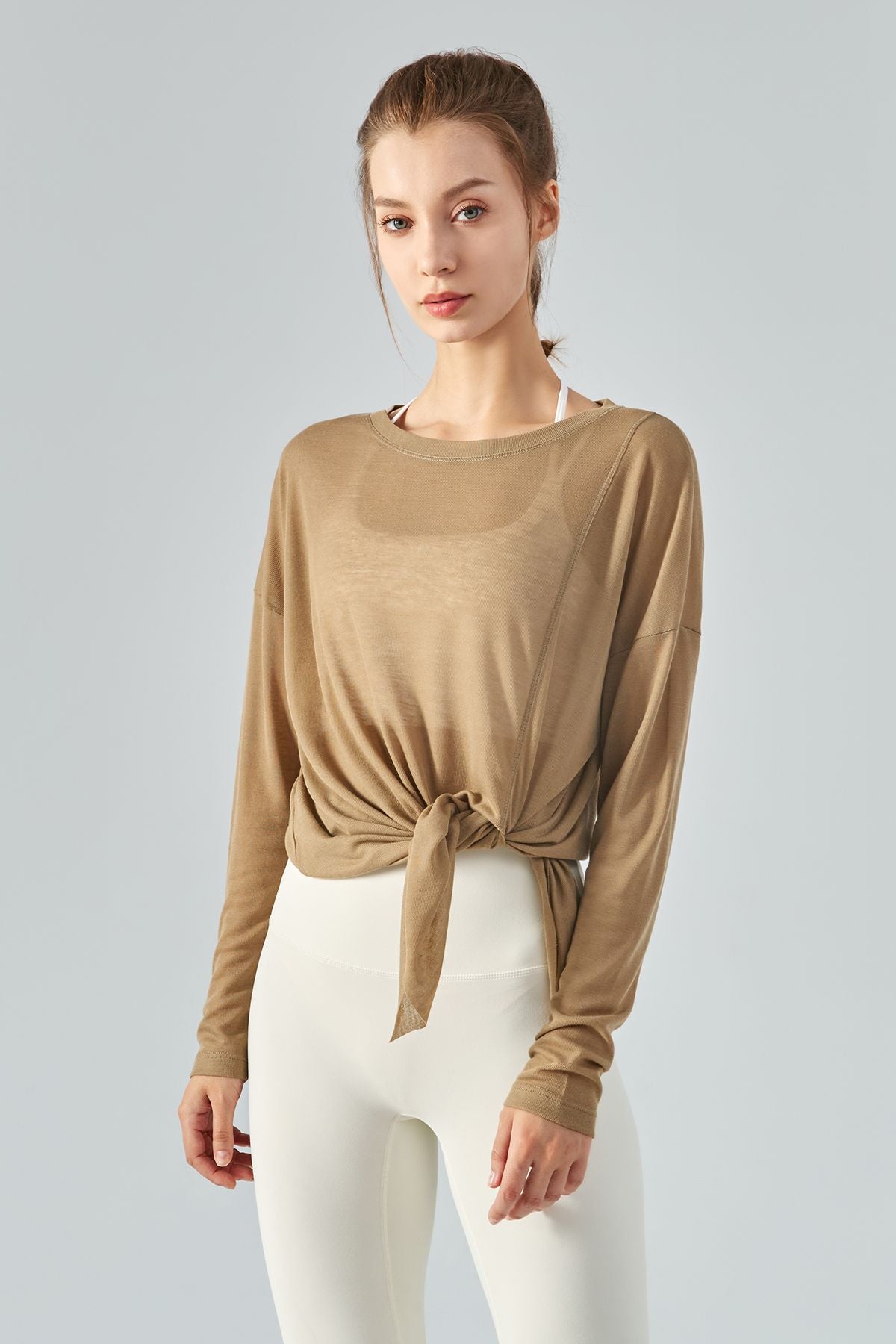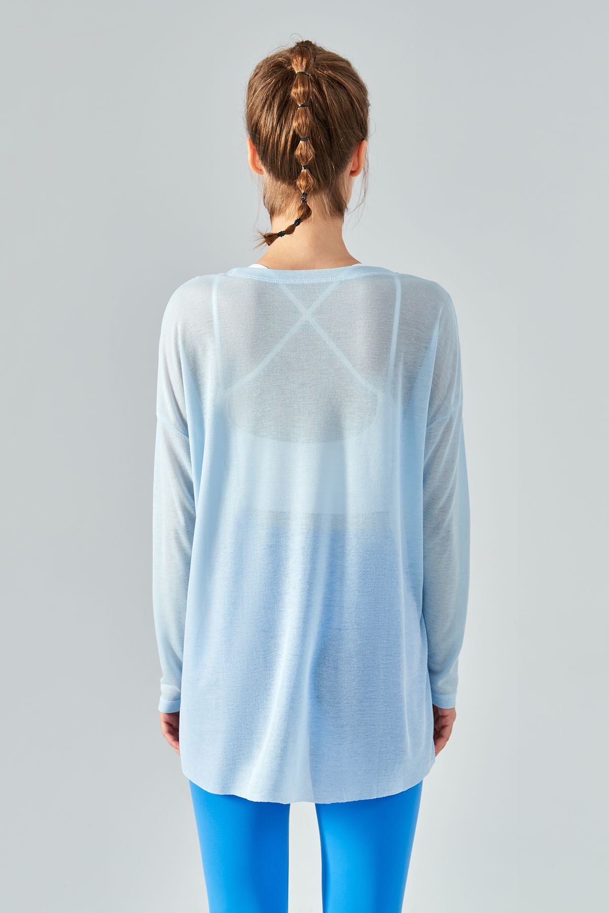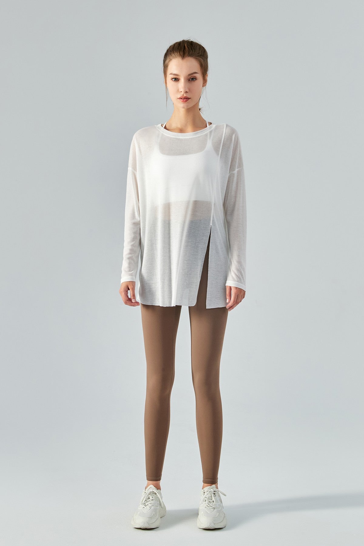 Featuring a sheer mesh fabric with a long sleeve and asymmetrical hem design, style this with strappy sports bra and workout leggings to complete the look.