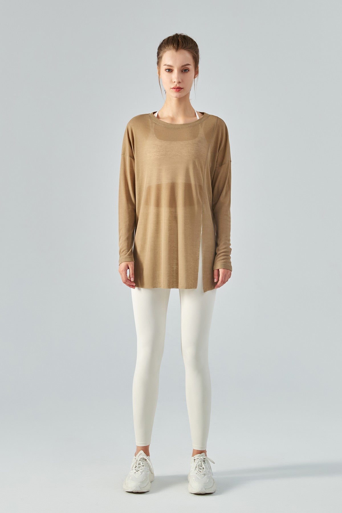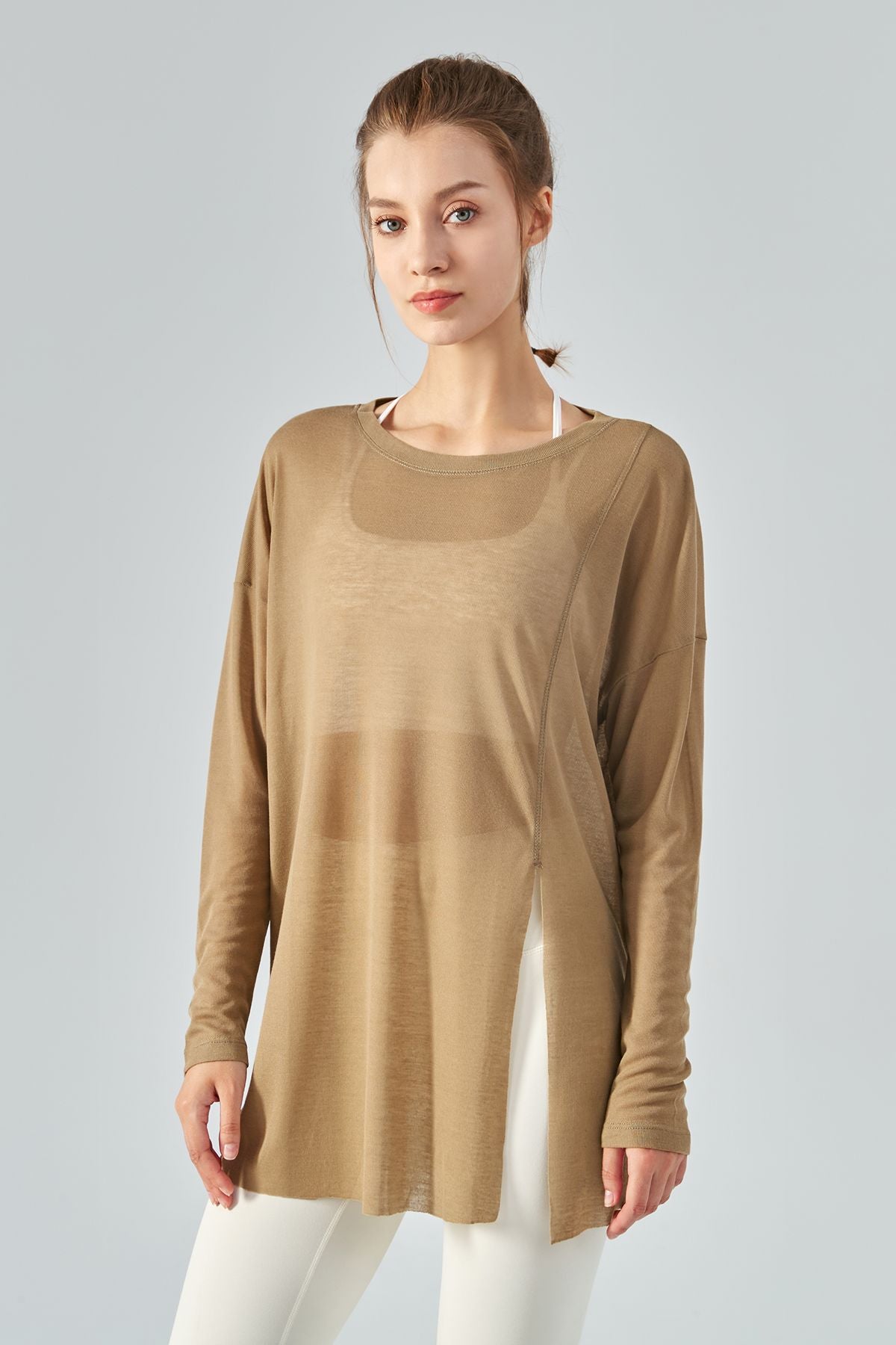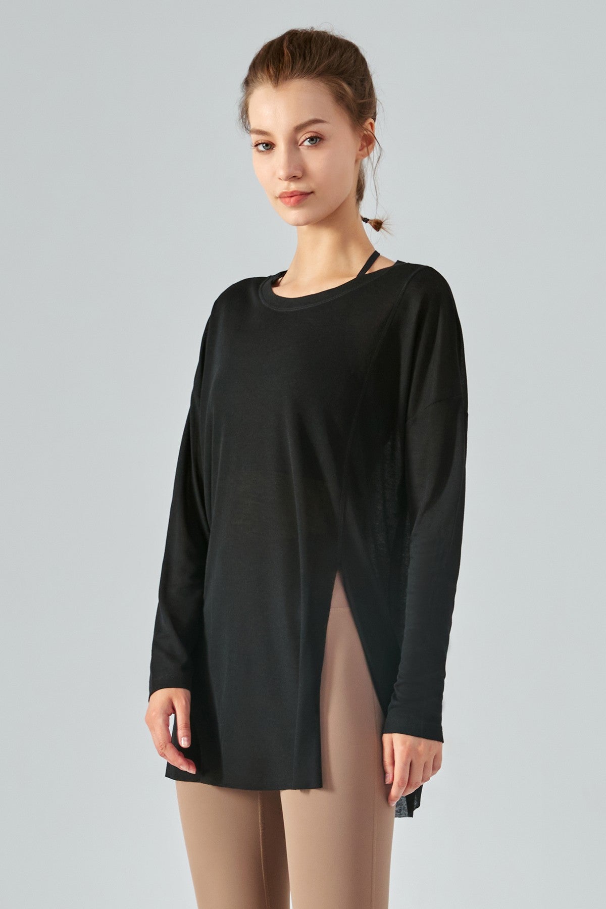 - Details: long sleeves, aasymmetrical hem, side split