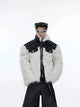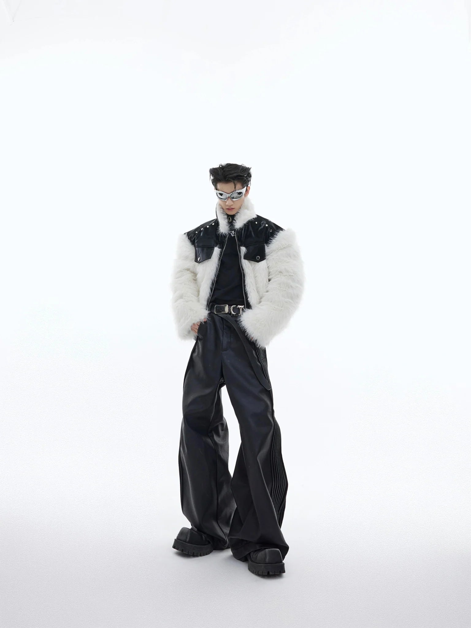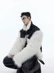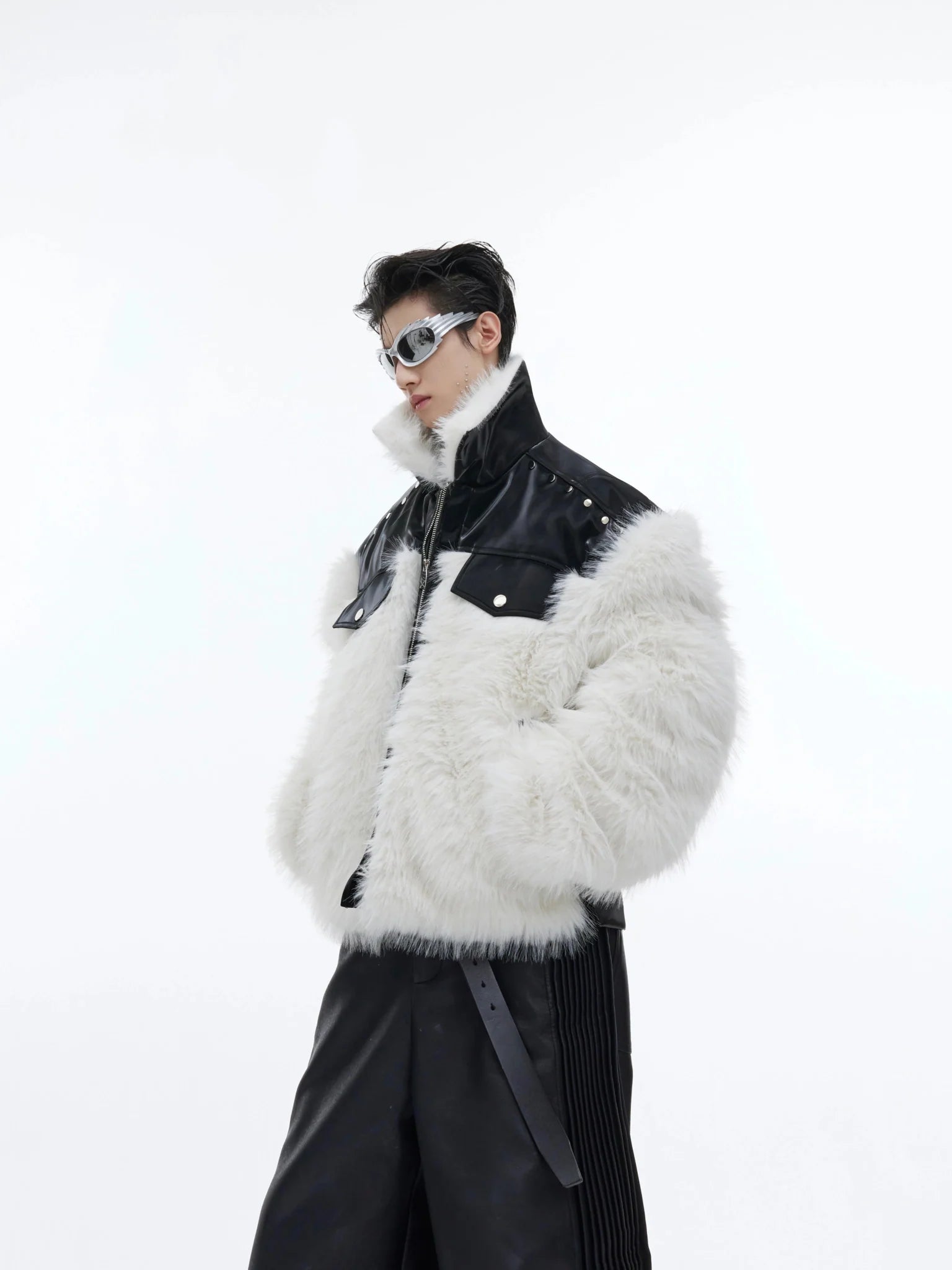 - Featuring a deconstructed faux fur patchwork with faux leather and subtle metal embellishments, this jacket is available in classic Black and White, making it a versatile and stylish addition to any wardrobe.