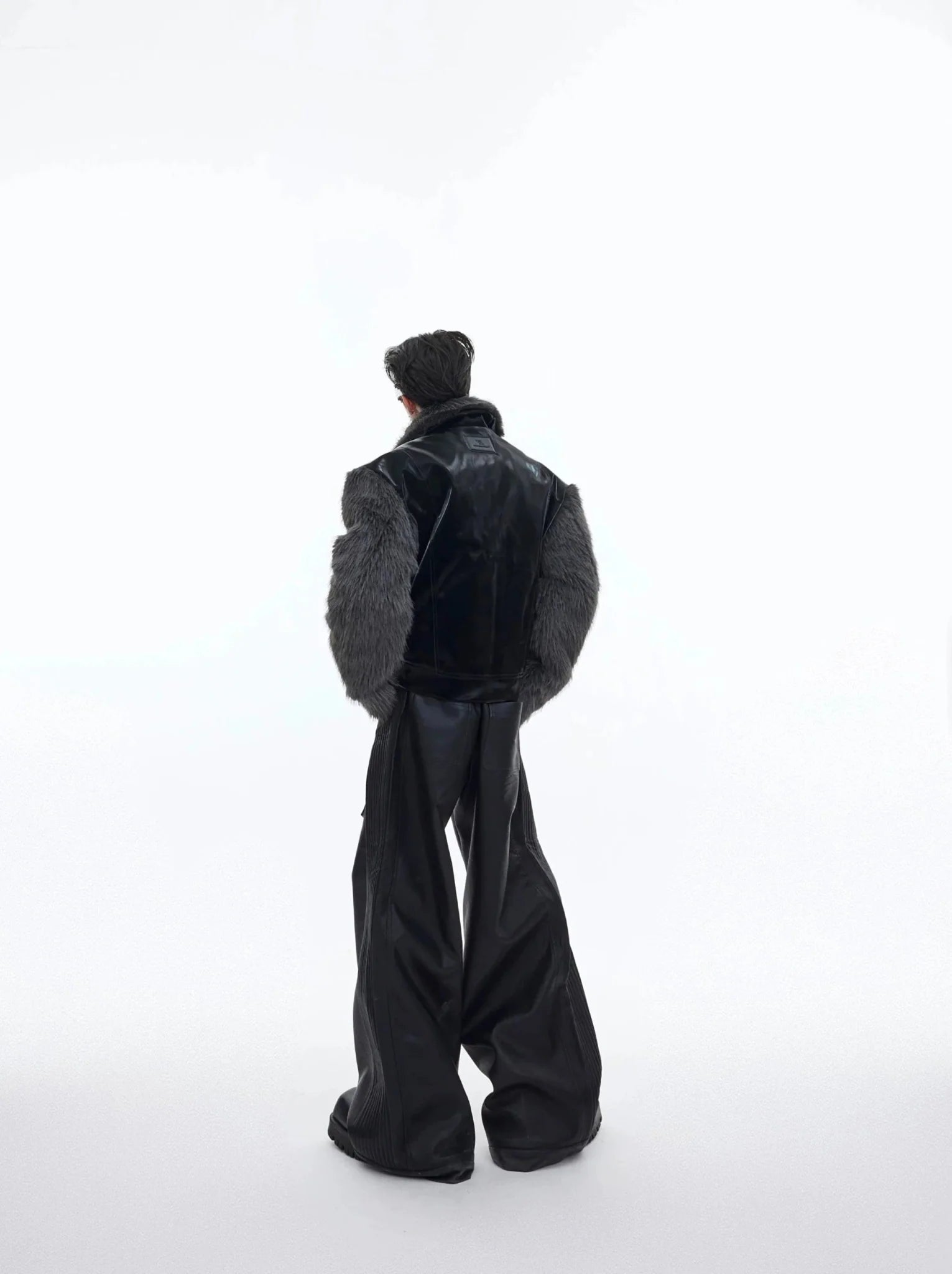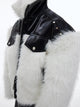 - This jacket elegantly combines the luxury of faux fur with the sleekness of faux leather, offering a sophisticated and contemporary look. Its intricate craftsmanship results in a unique texture and feel, emphasizing understated elegance.