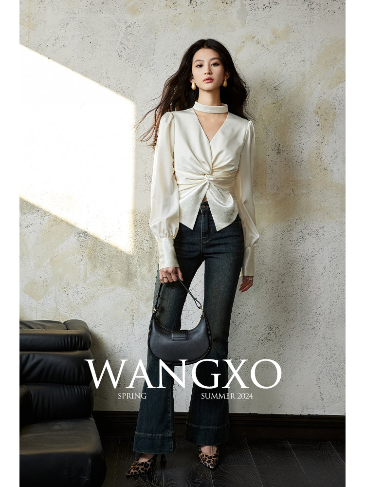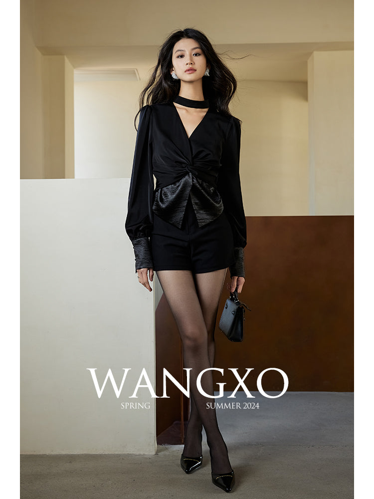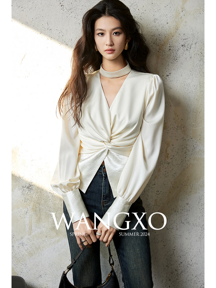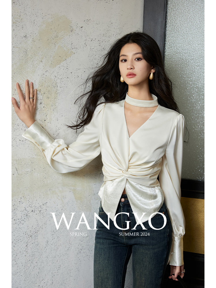 Matte Satin V-Neck Halter Long Sleeve Shirt