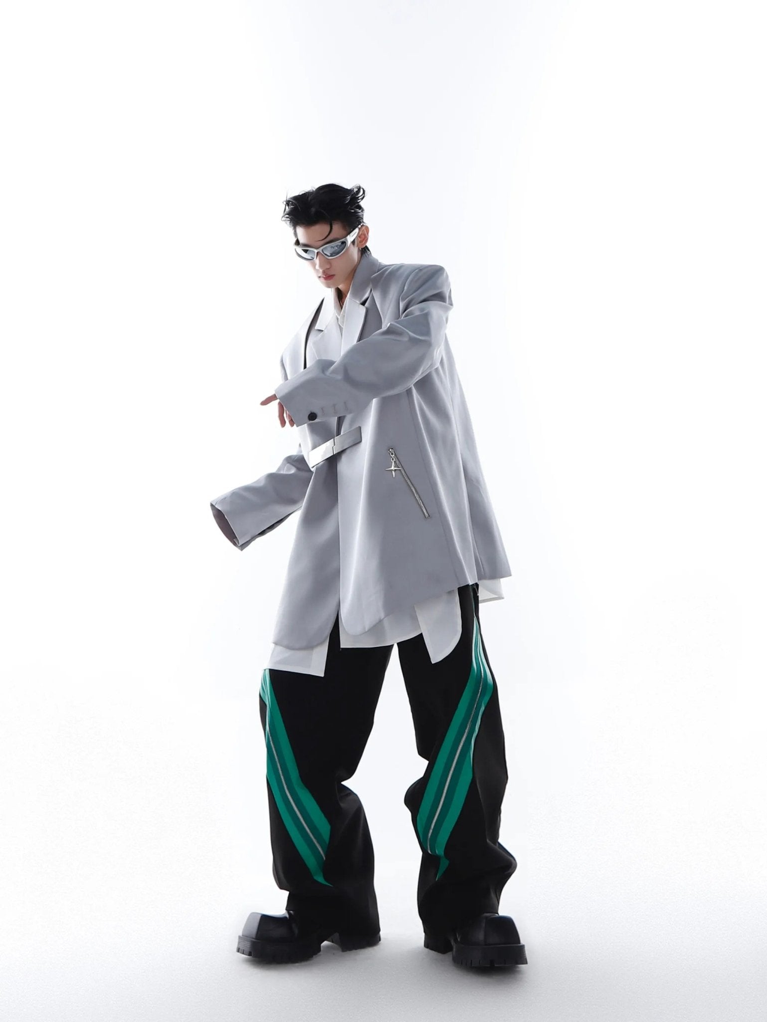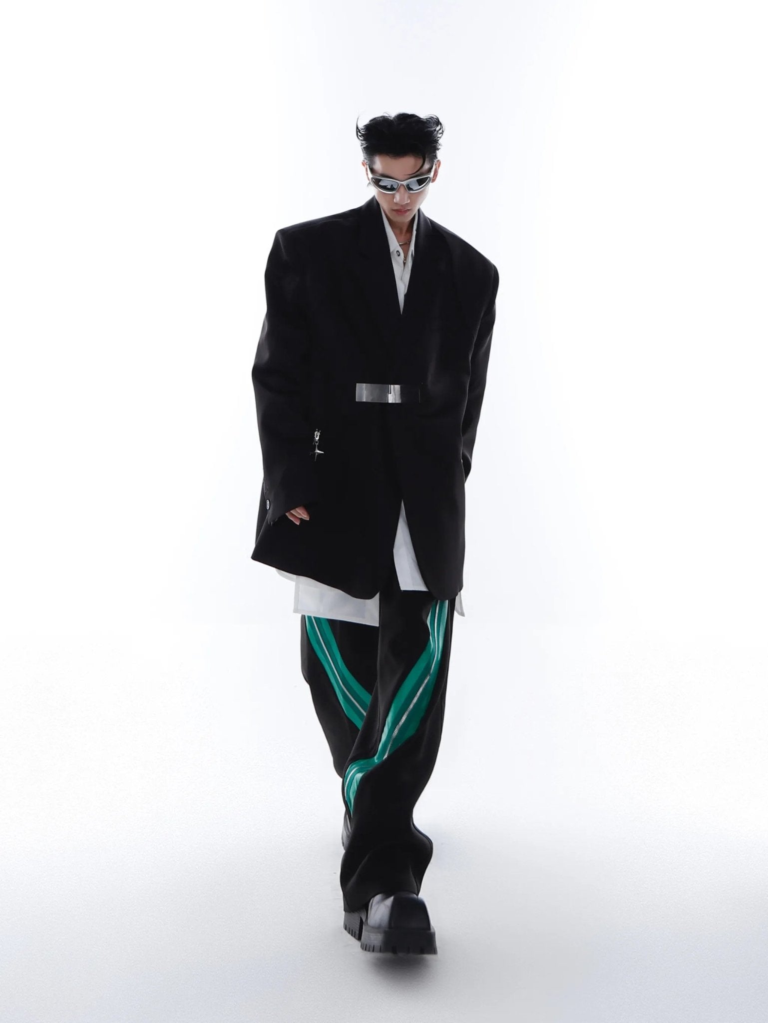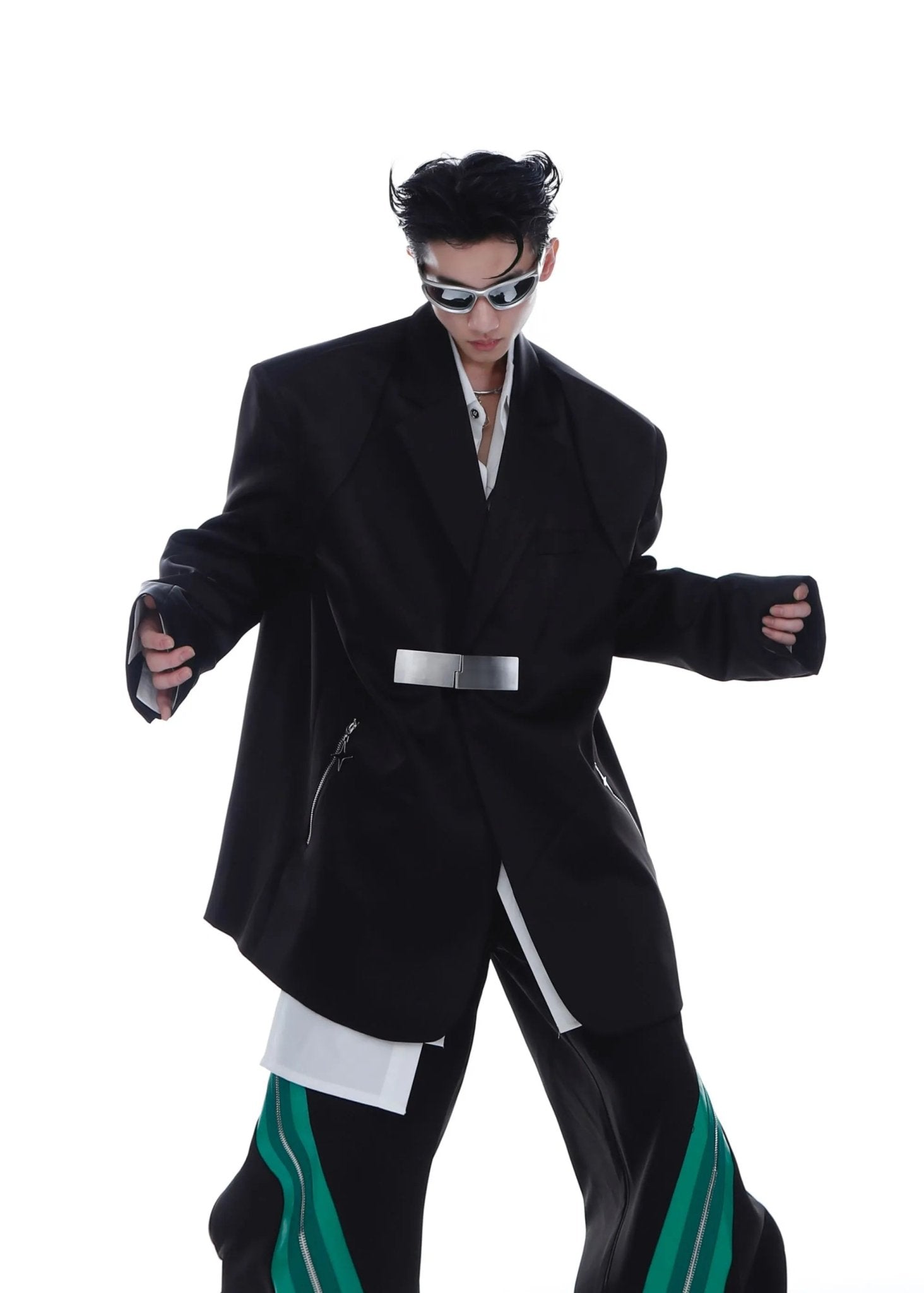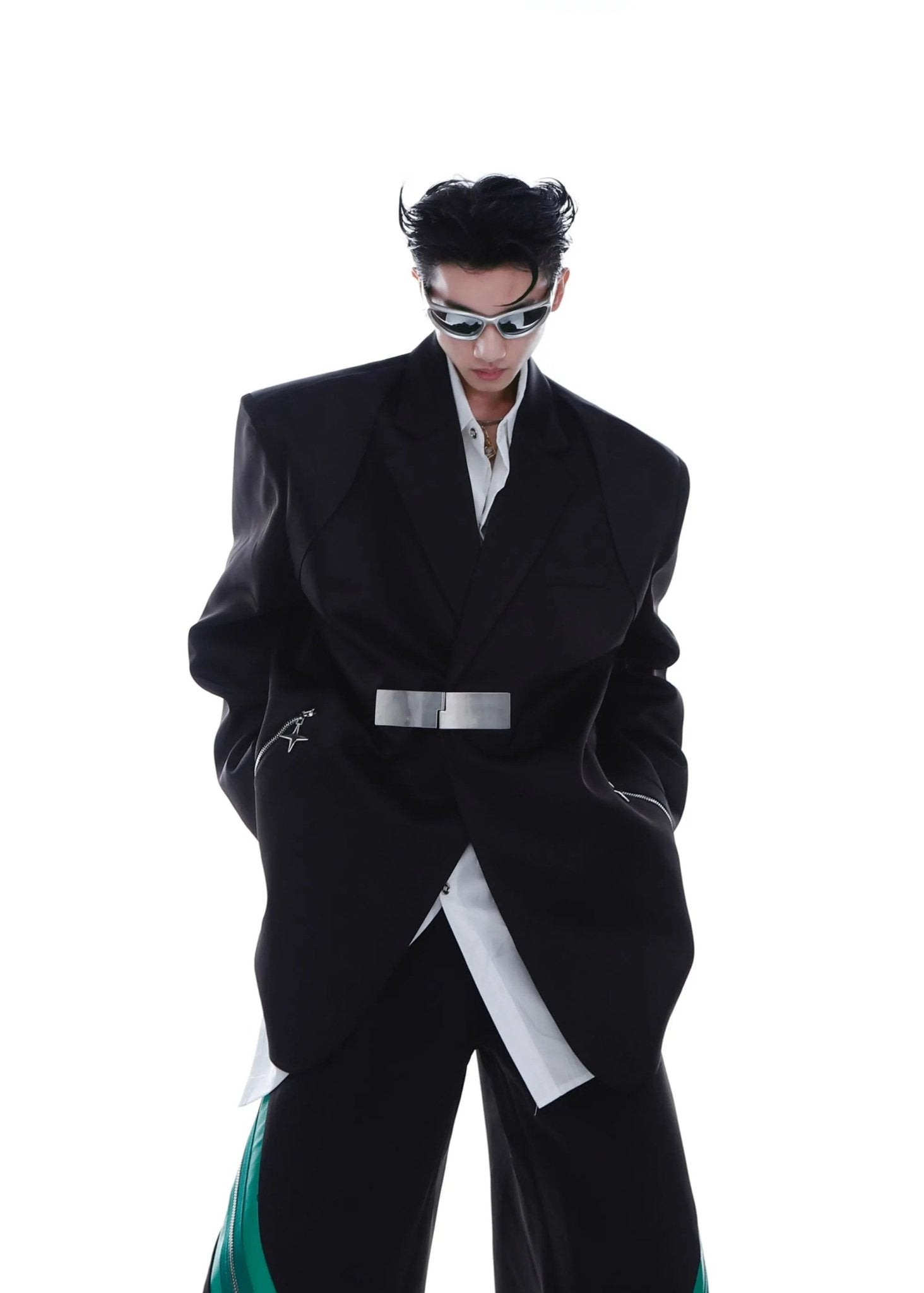 - Our Metallic Clasp Shoulder-Padded Blazer is a testament to avant-garde fashion. Crafted with a focus on unisex design, it stands out with its unique metallic clasp and zipper embellishments, offering a modern twist to the classic blazer silhouette.