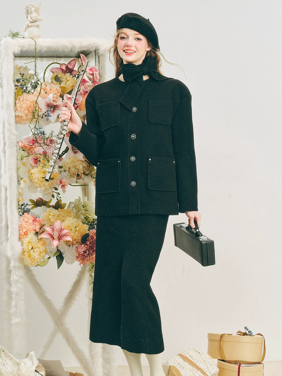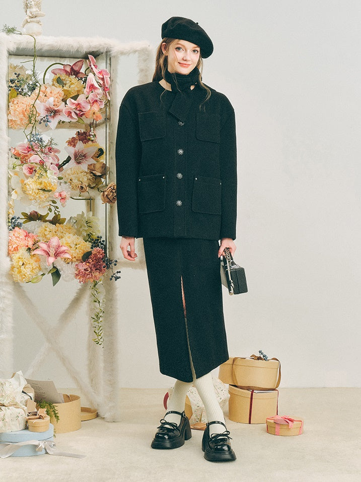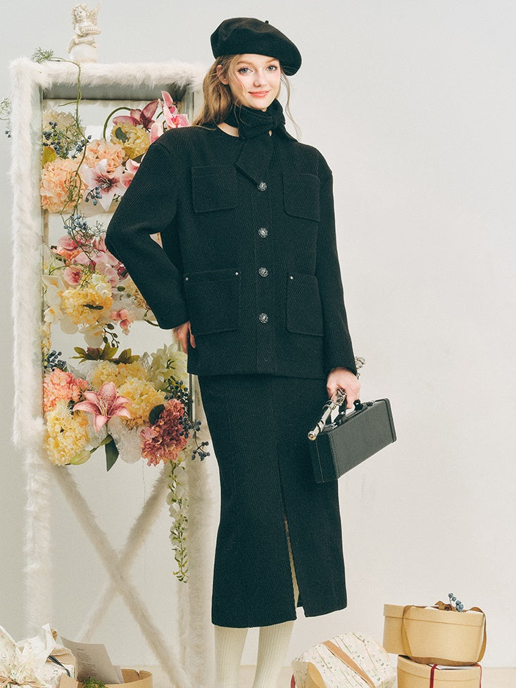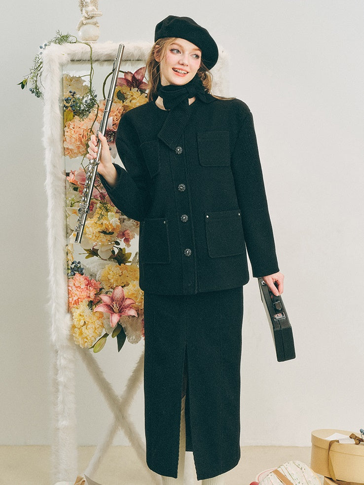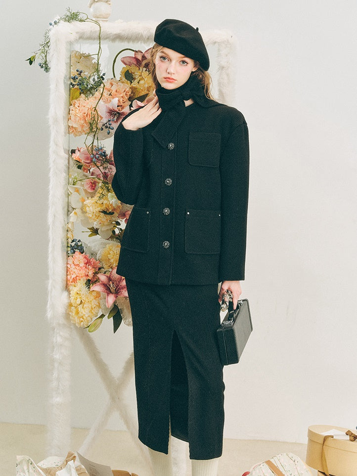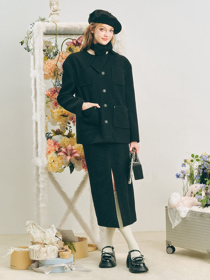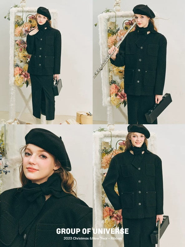 Neck Ribbon Design Short Jacket & Slit Skirt