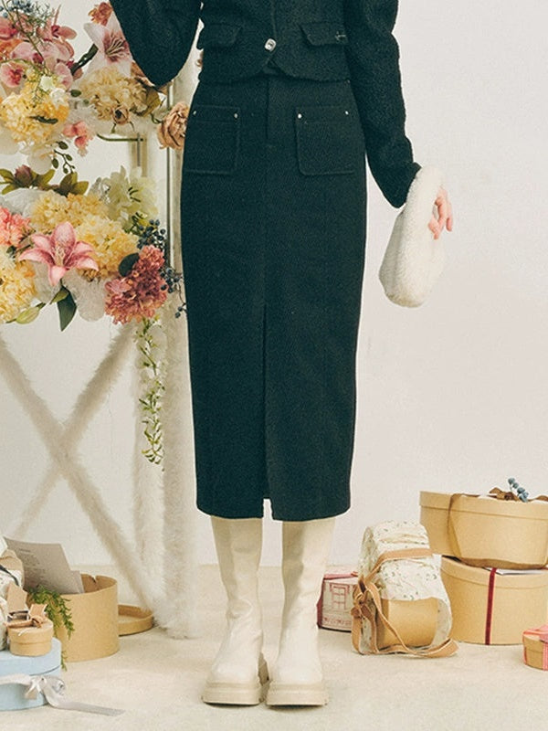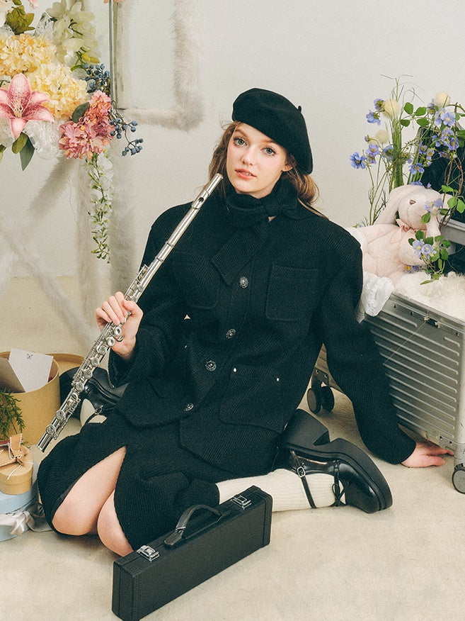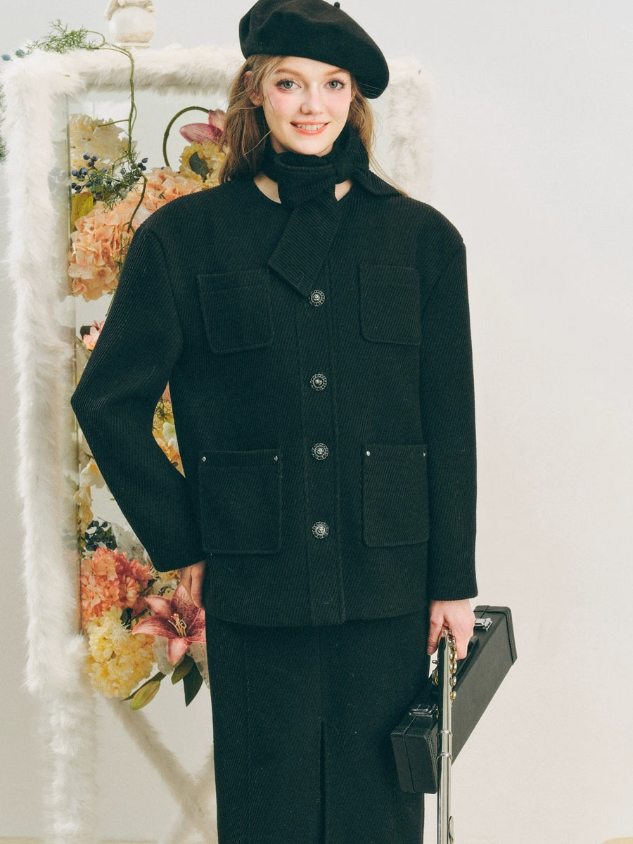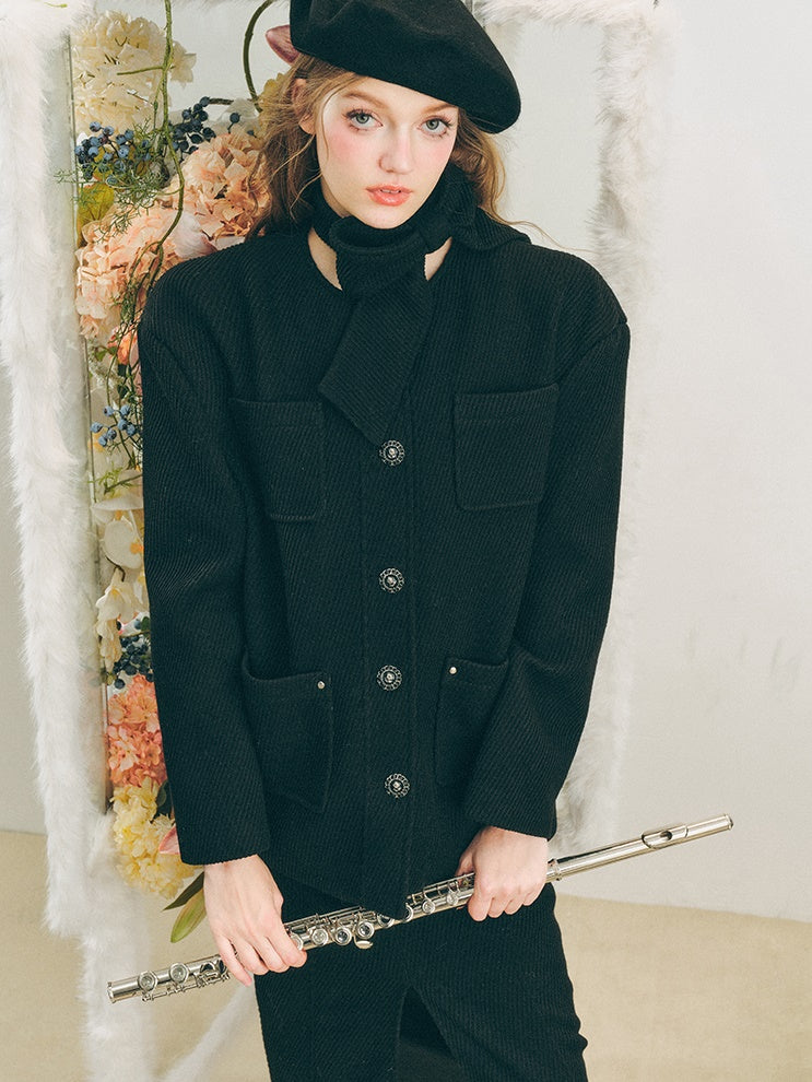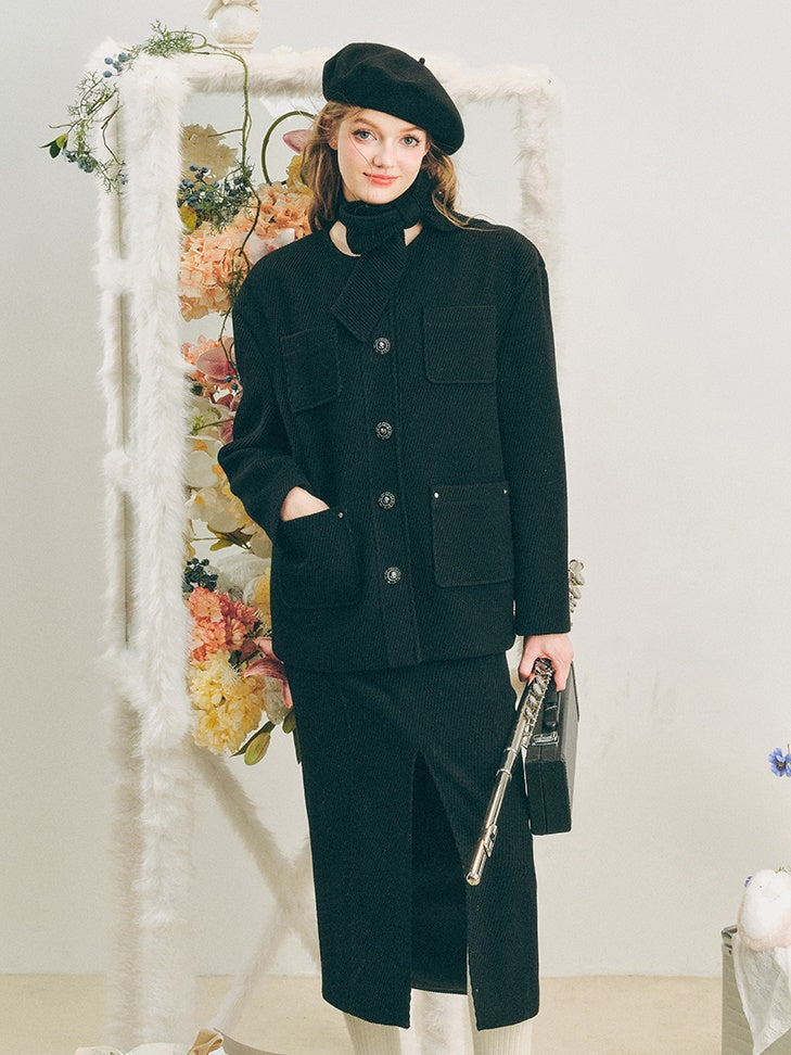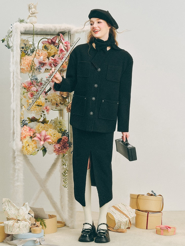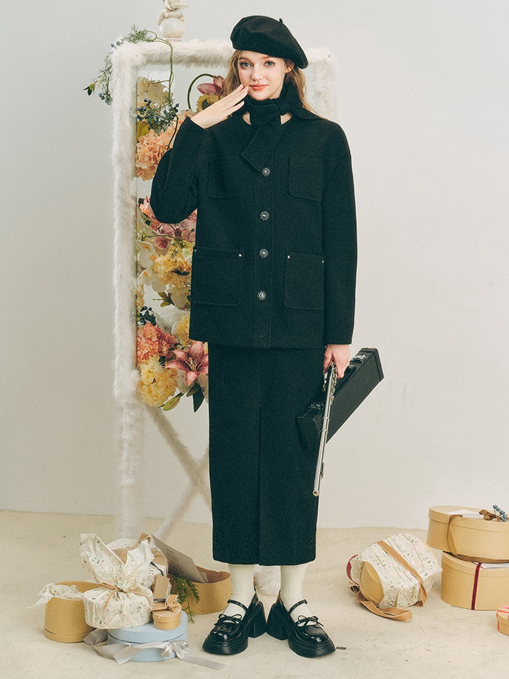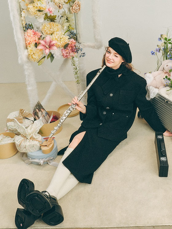 Neck Ribbon Design Short Jacket & Slit Skirt