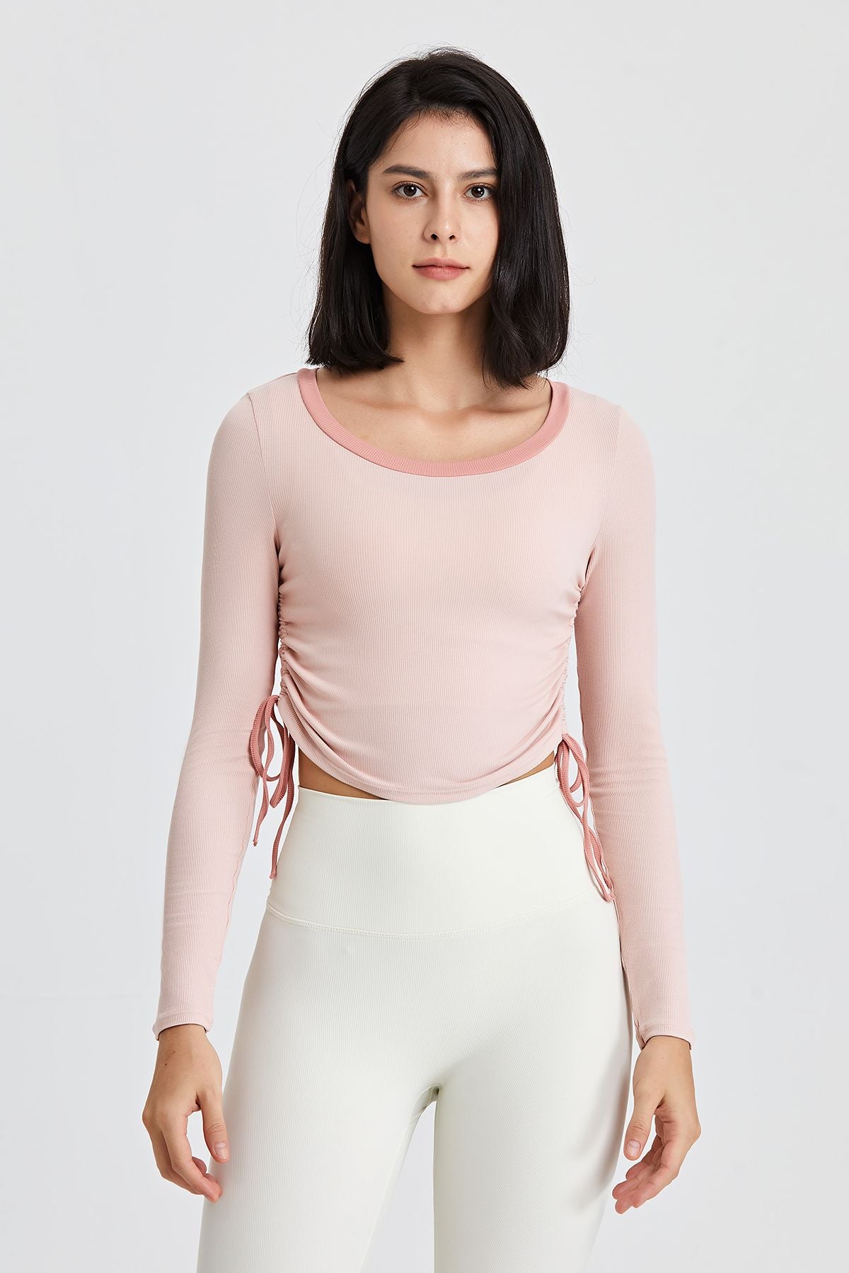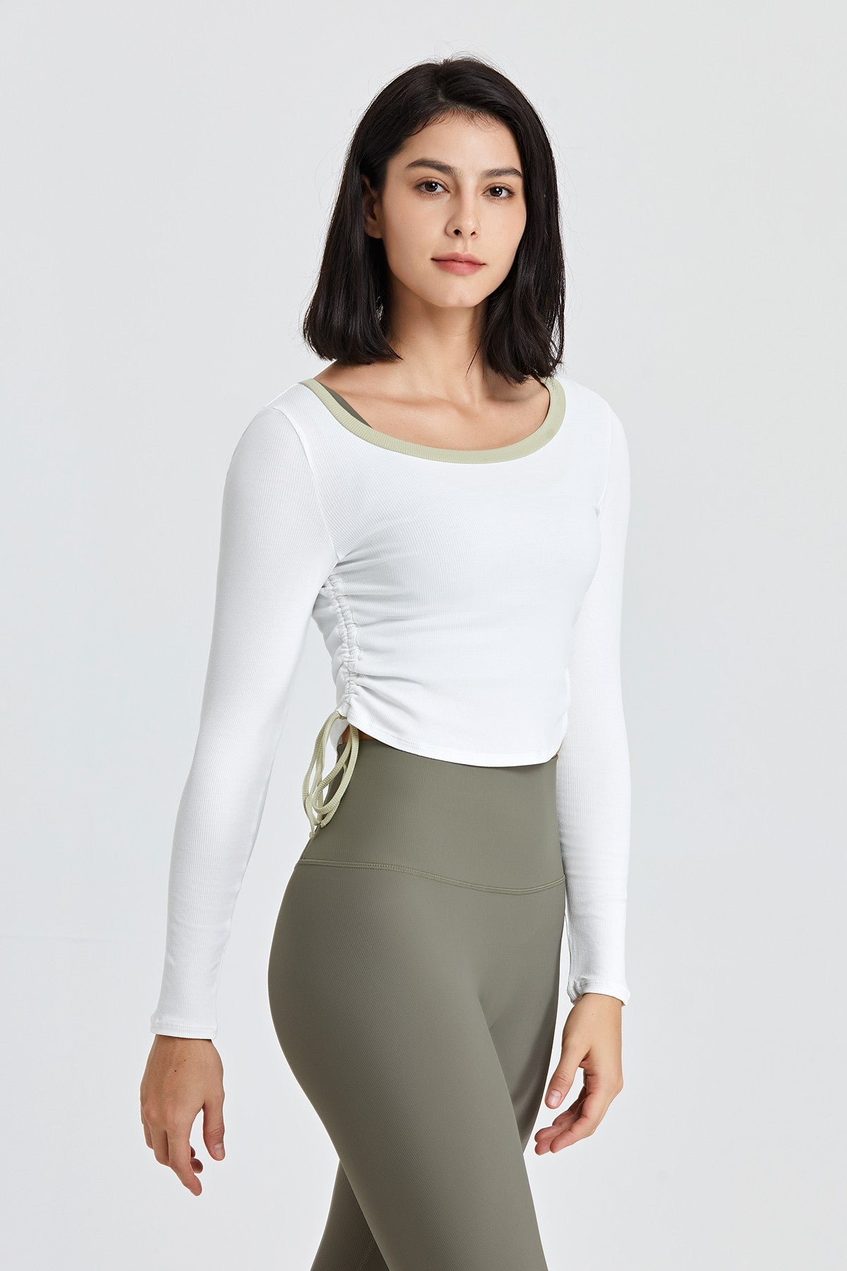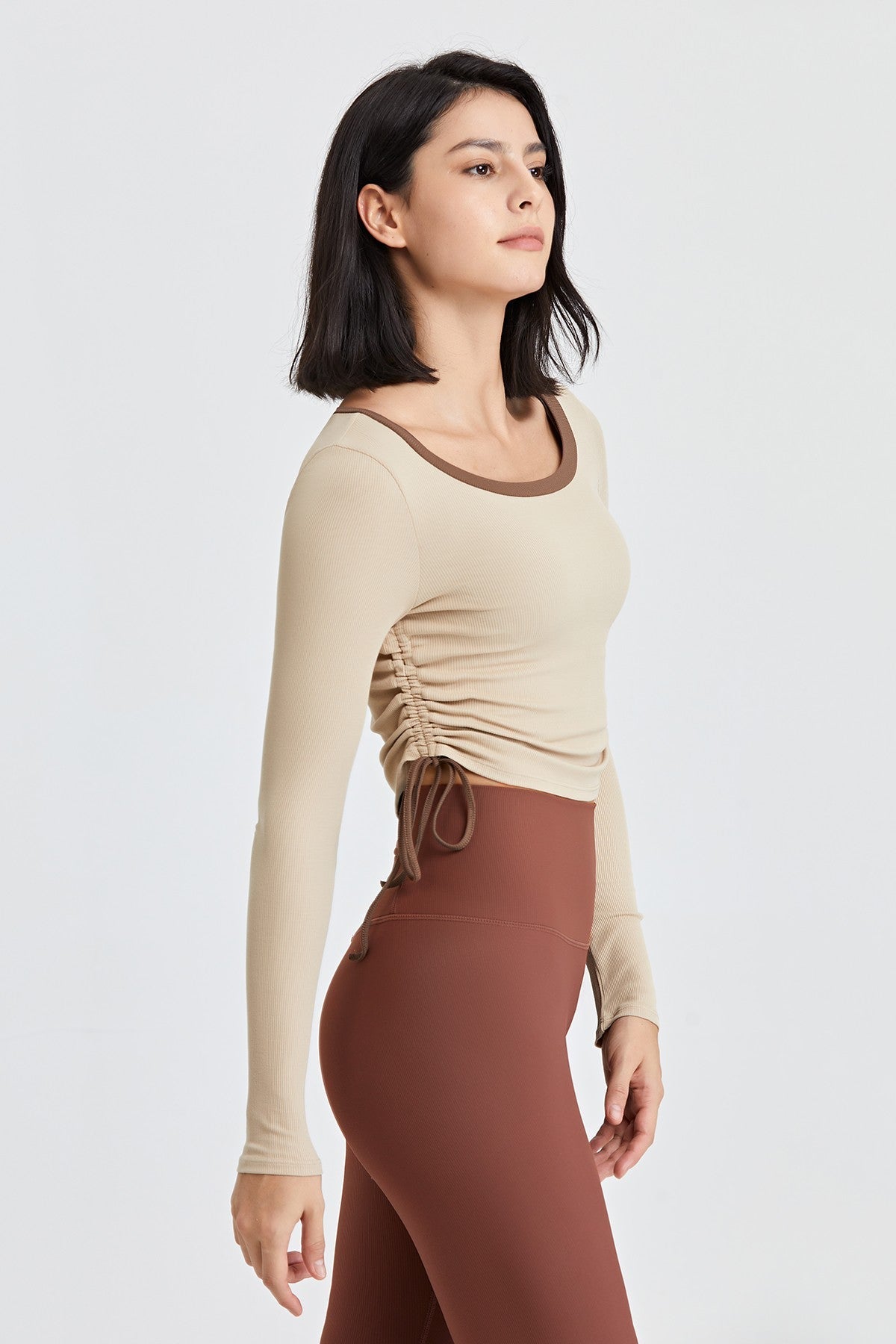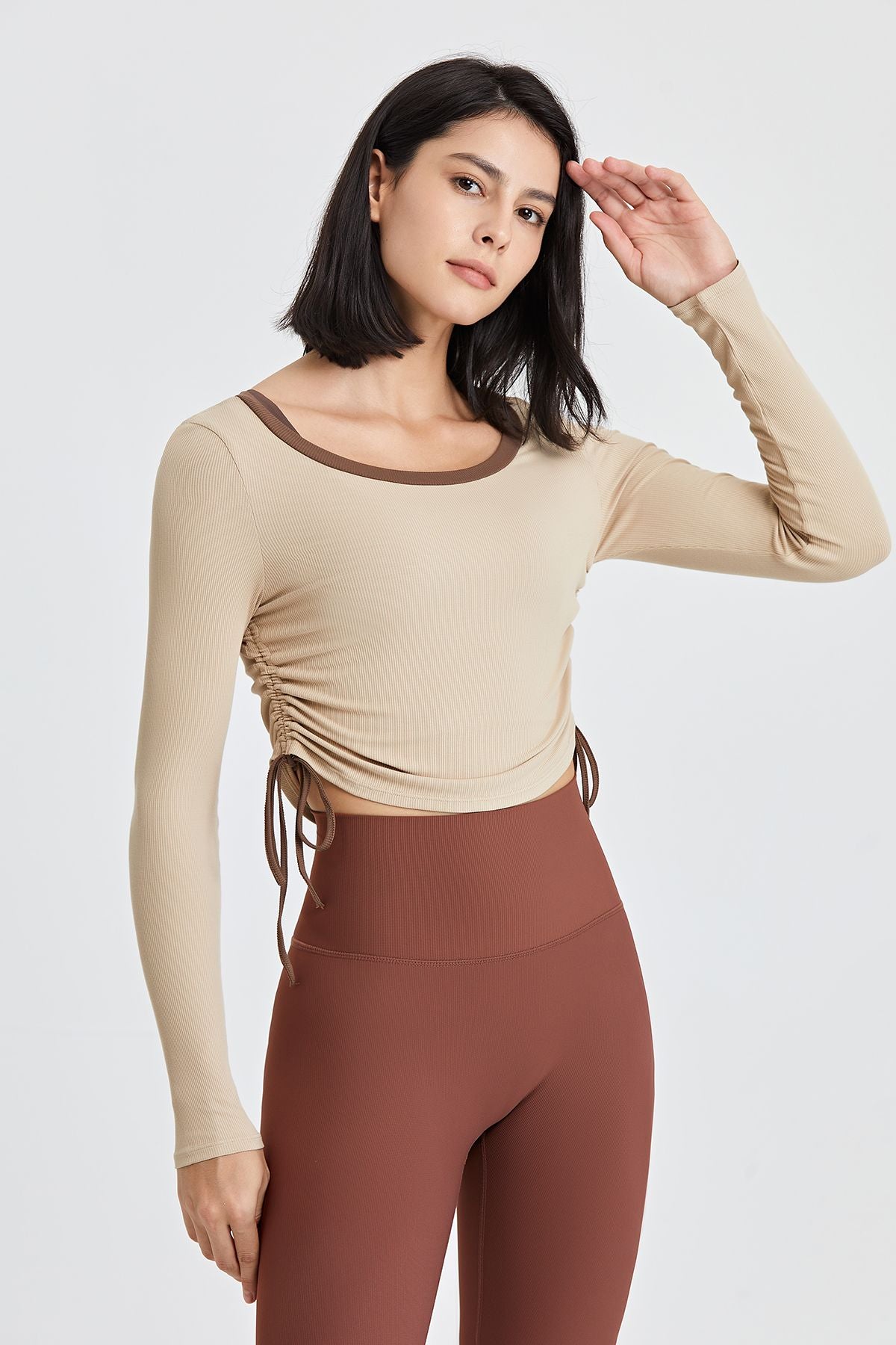This fitted sports top featuring a stretchy ribbed fabric with ruched side adjustable drawstring, long sleeves and crew neckline. Enhanced with a vibrant contrast trim design elevates the stylish appeal of a versatile tops.
