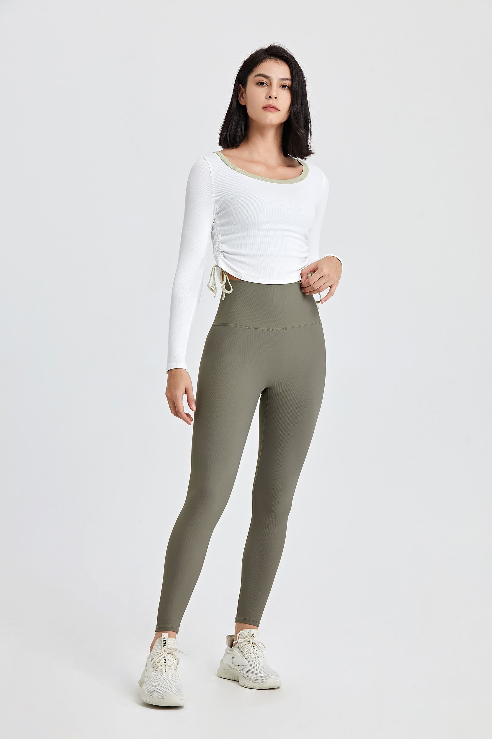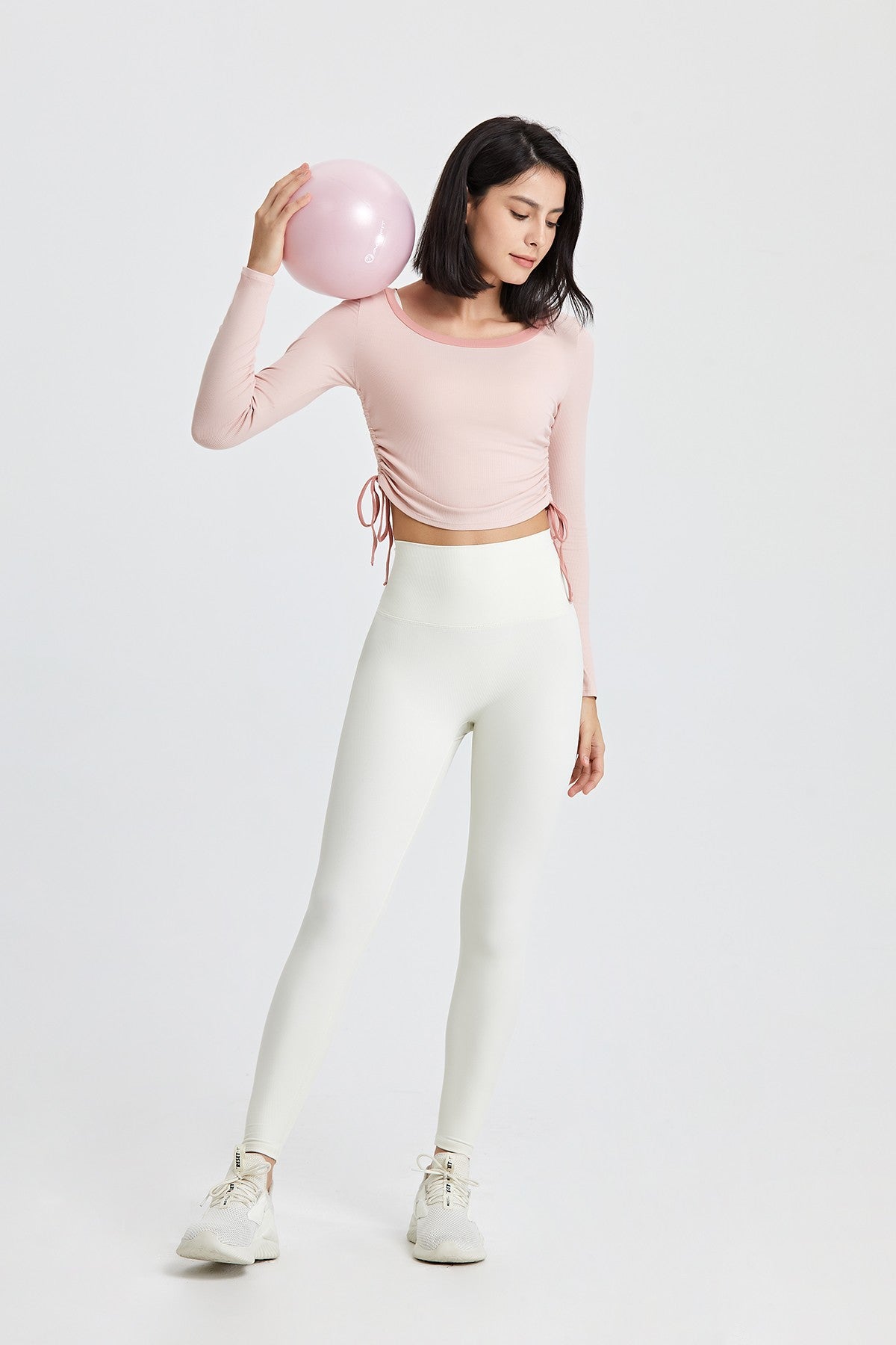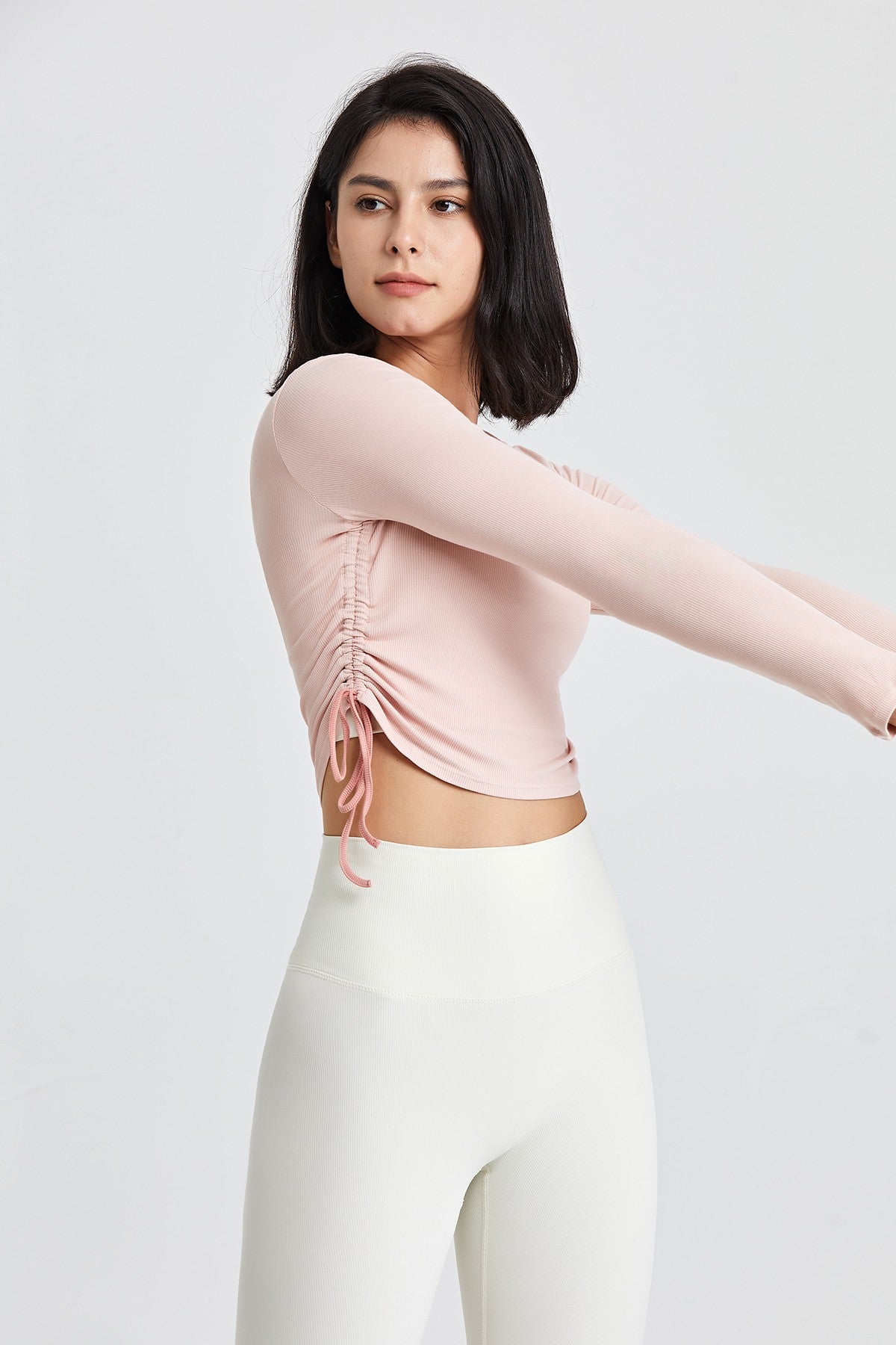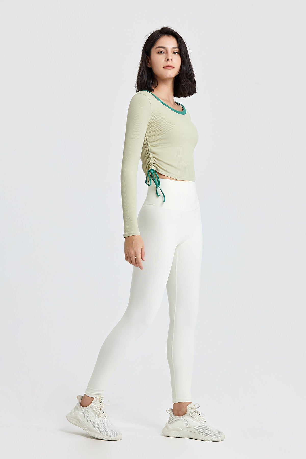 This fitted sports top featuring a stretchy ribbed fabric with ruched side adjustable drawstring, long sleeves and crew neckline. Enhanced with a vibrant contrast trim design elevates the stylish appeal of a versatile tops.