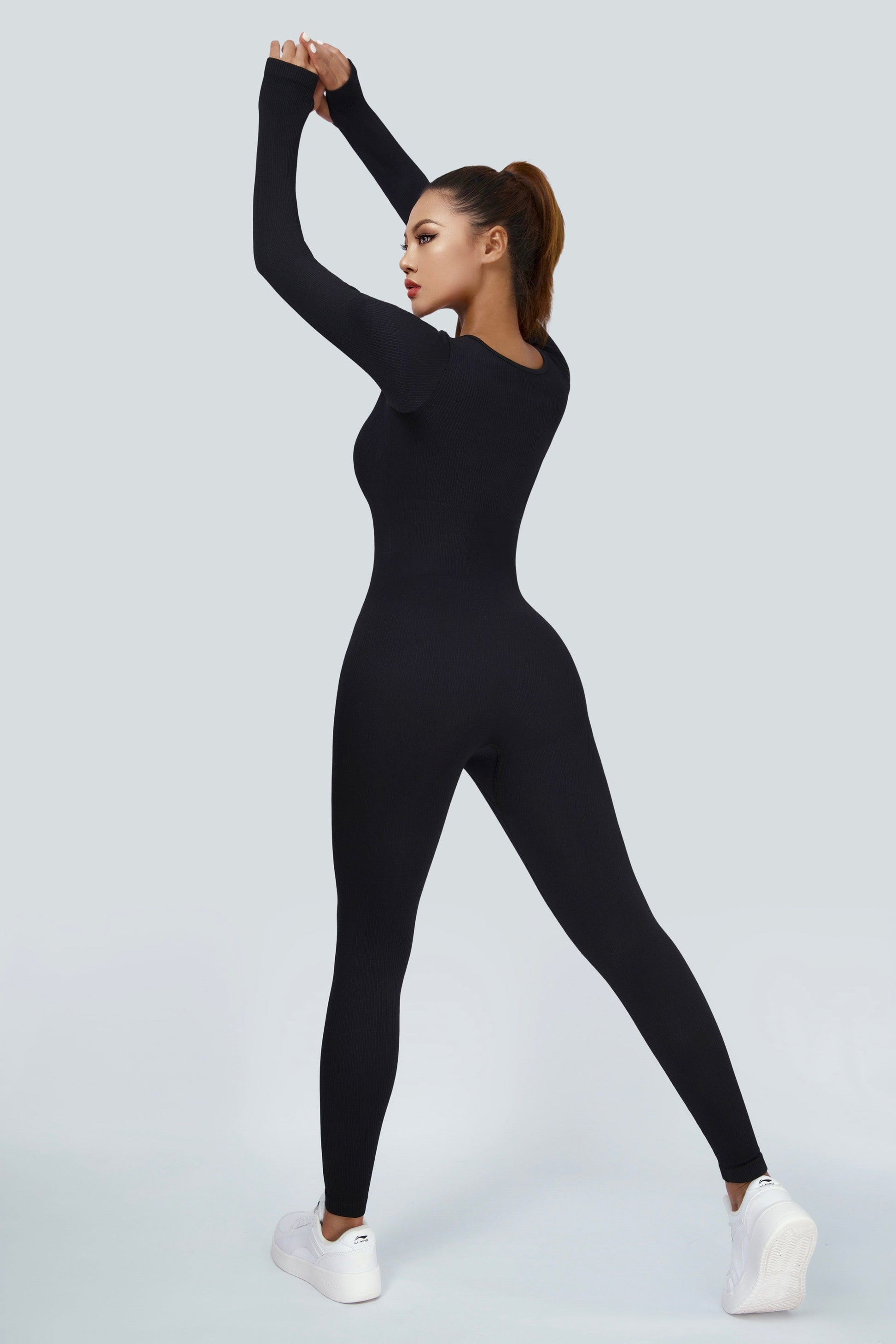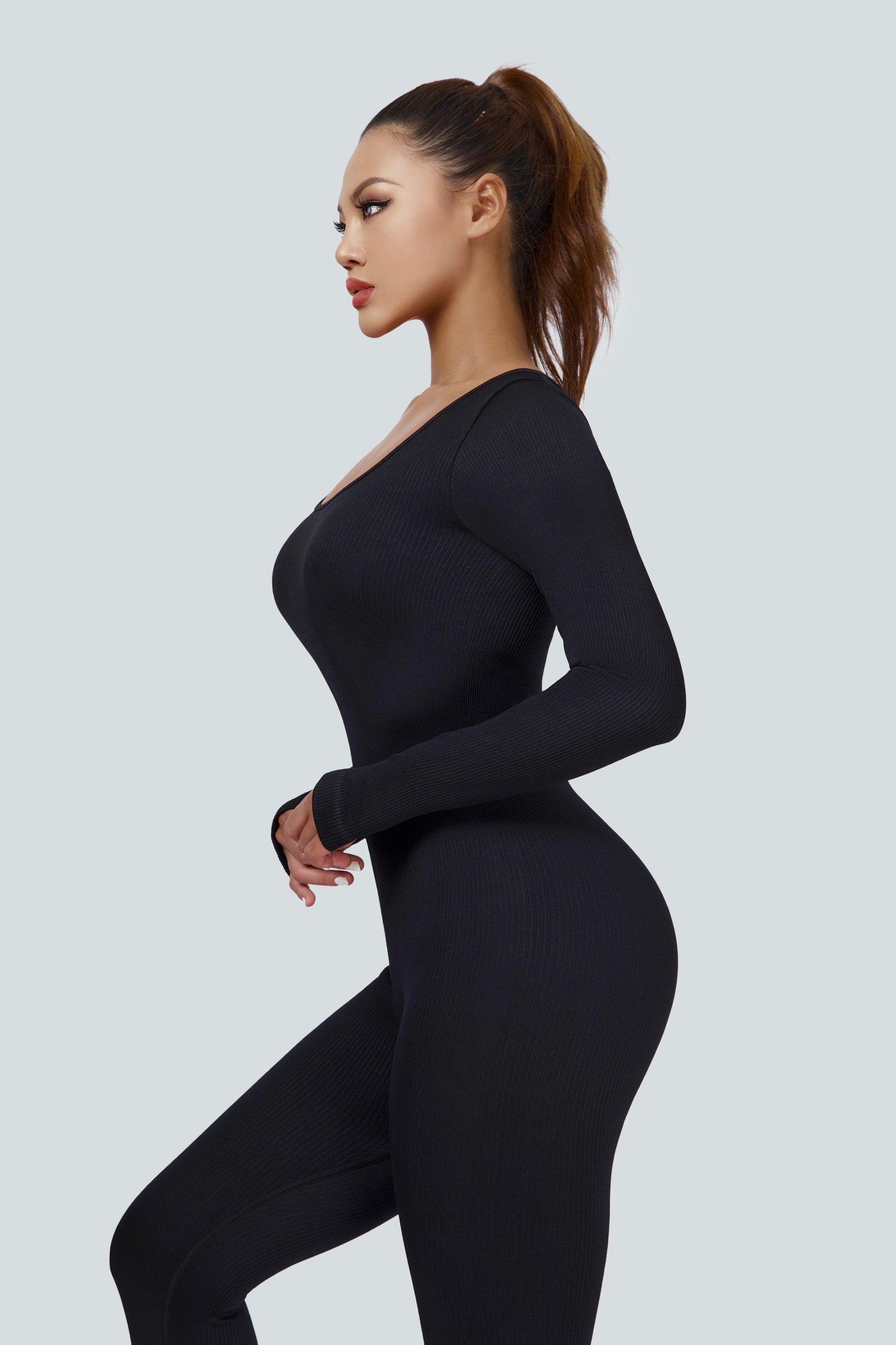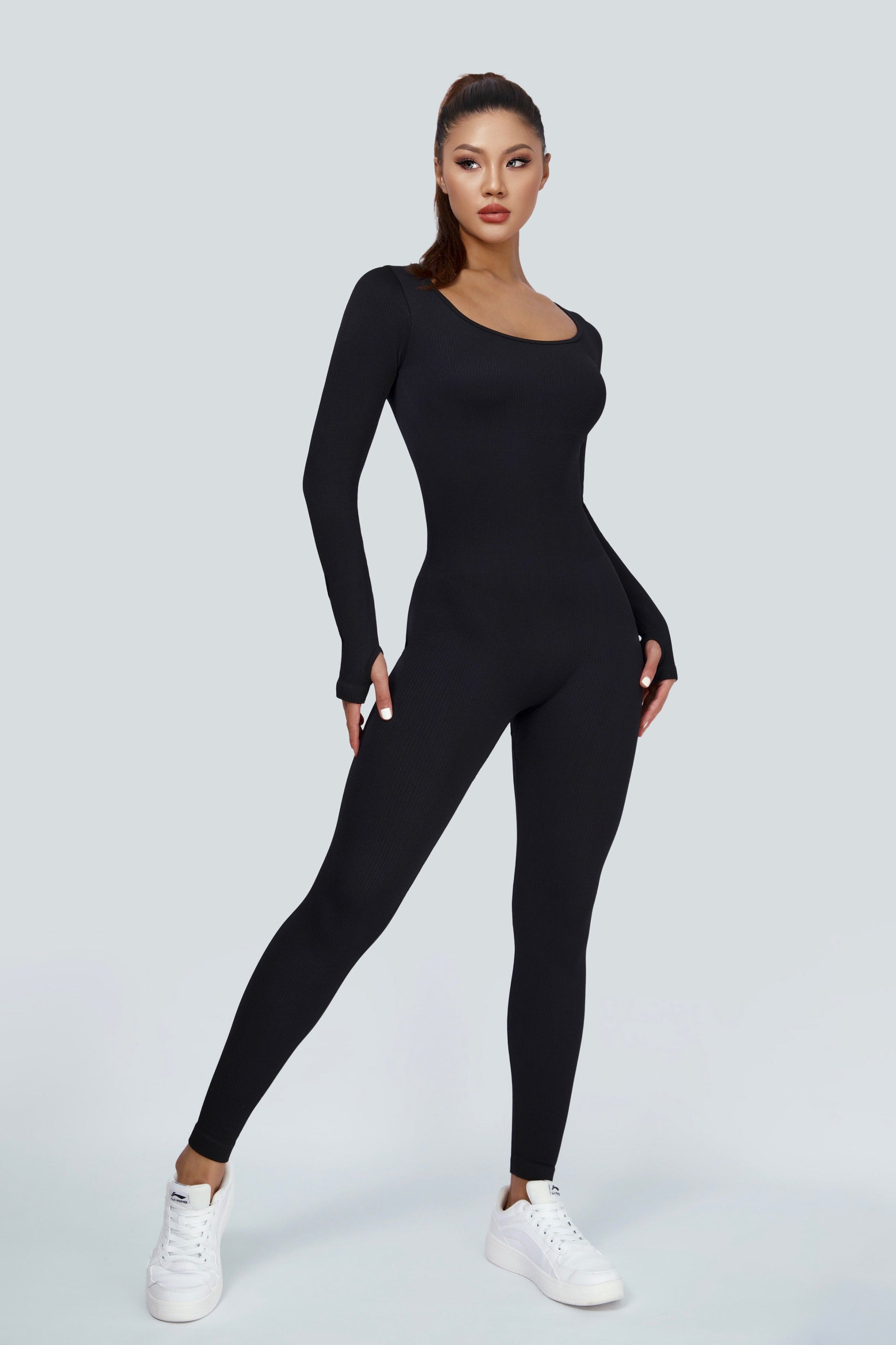 Experience the refined charm of our ribbed knit jumpsuit, meticulously designed for a streamlined appearance. This piece features a tasteful scoop neckline and is complemented by long sleeves with unique thumbholes. Its form-fitting structure beautifully shapes your figure, providing an elegant and complimentary fit for any occasion.