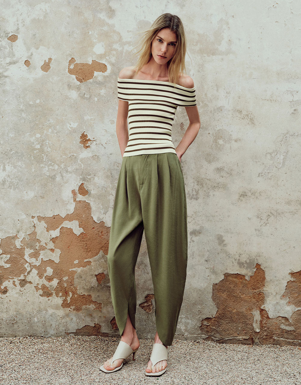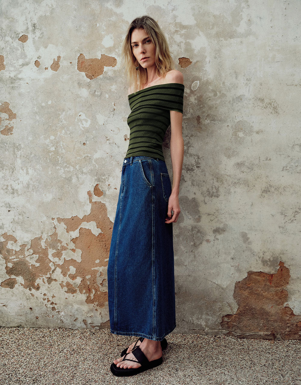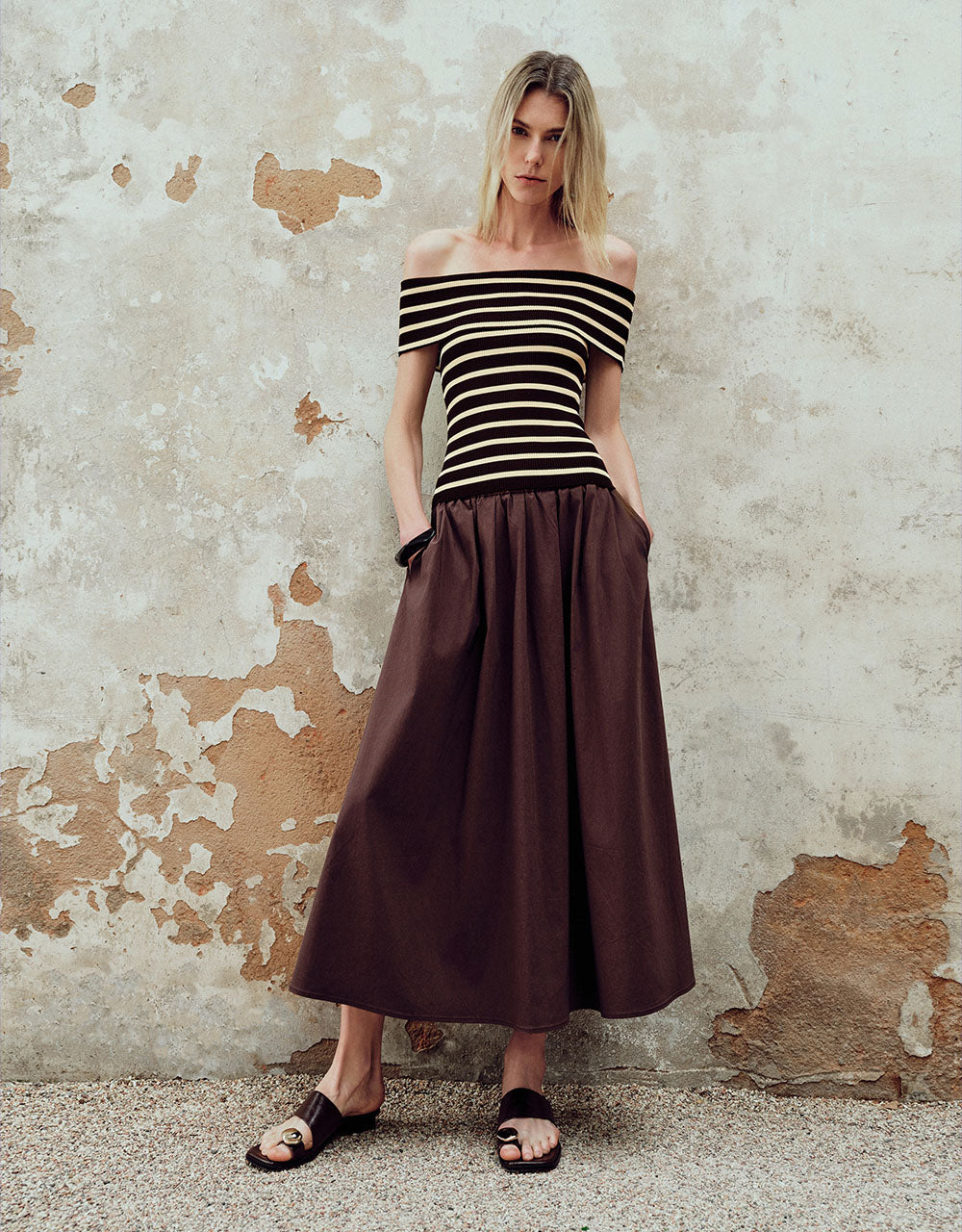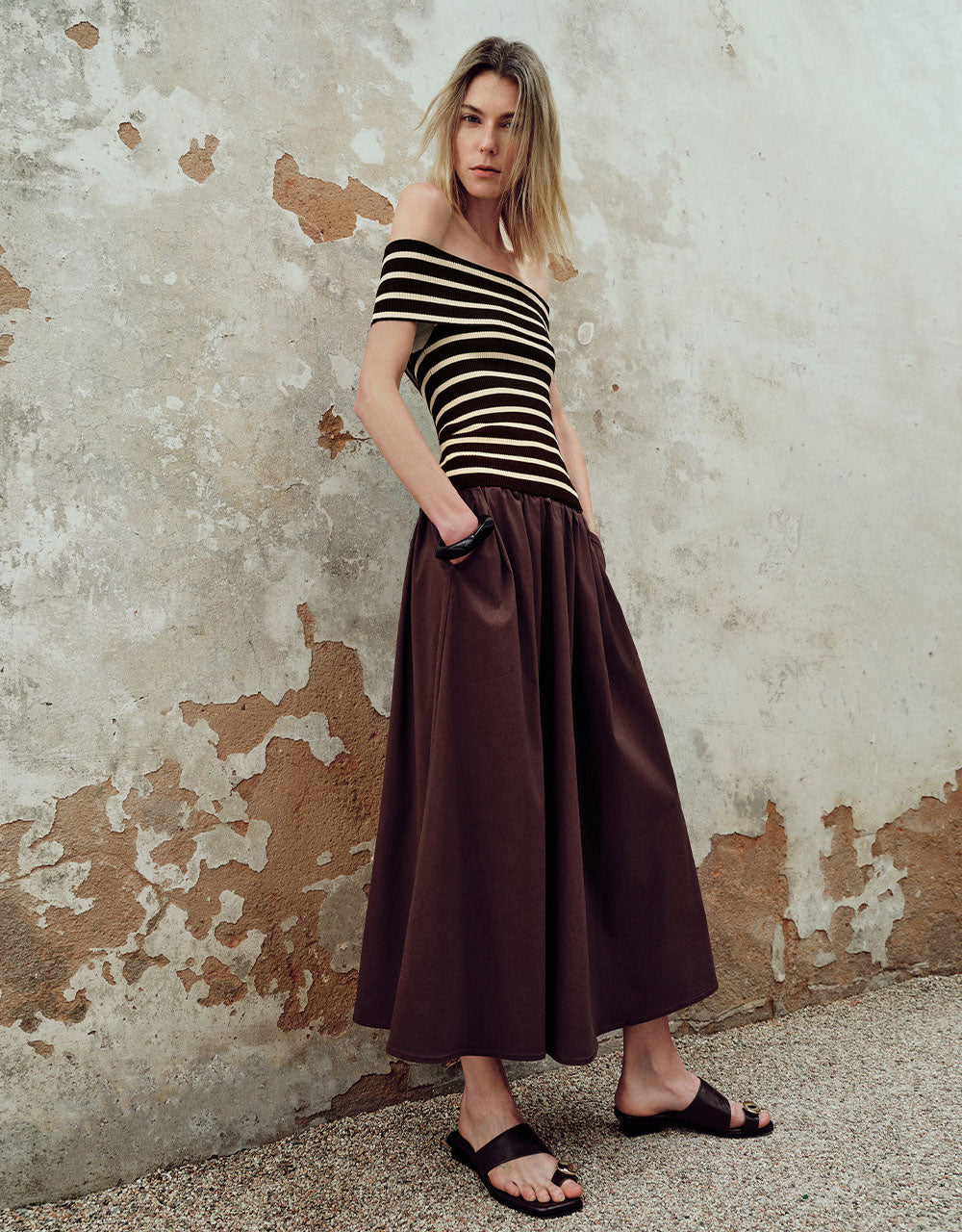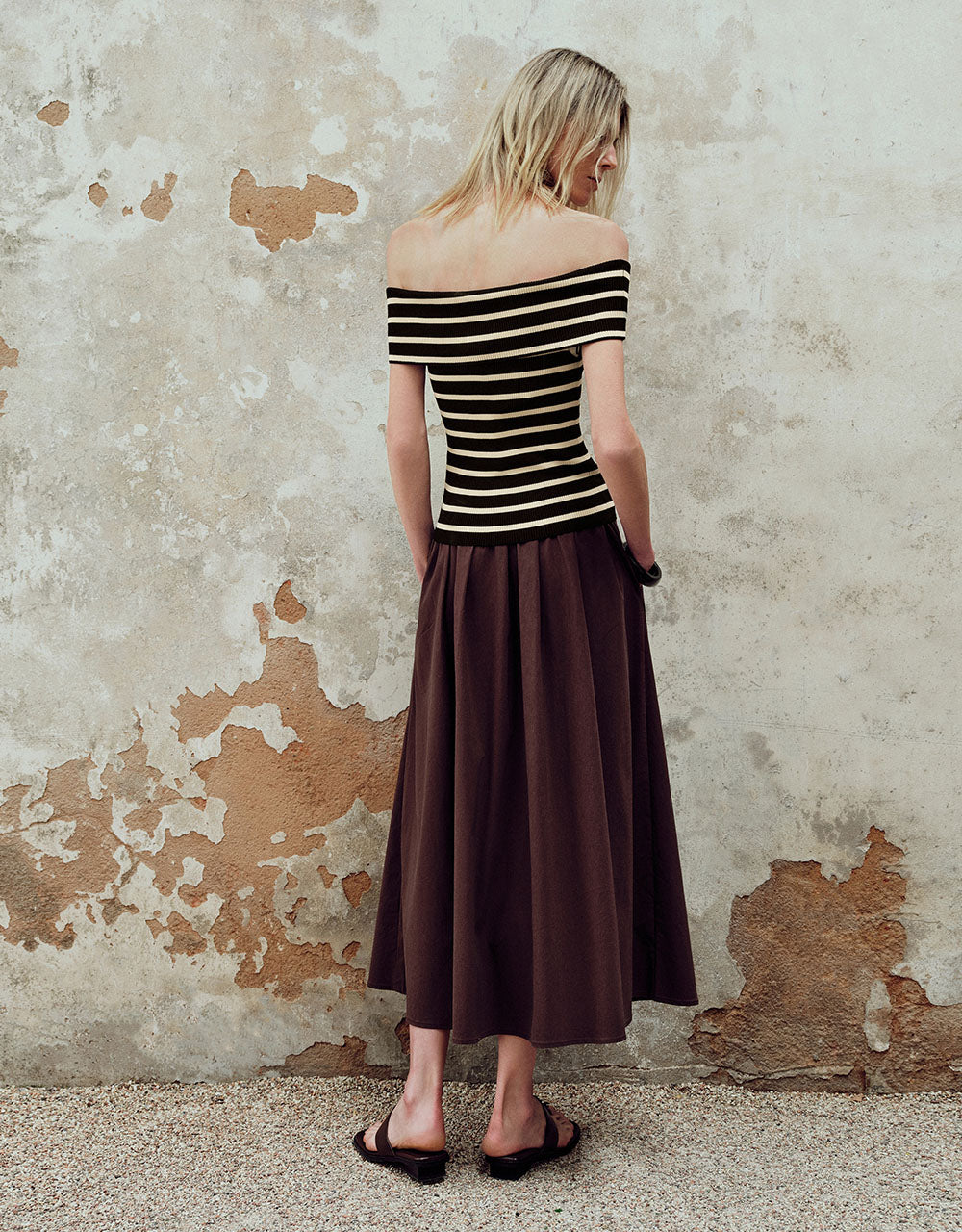 Striped Off-Shoulder Knitted T-Shirt