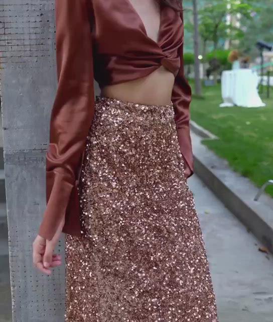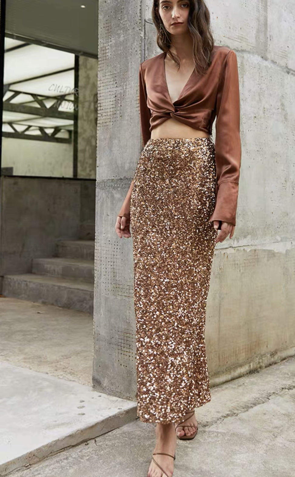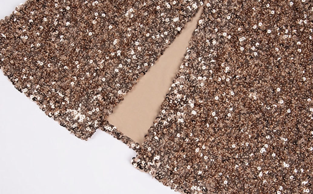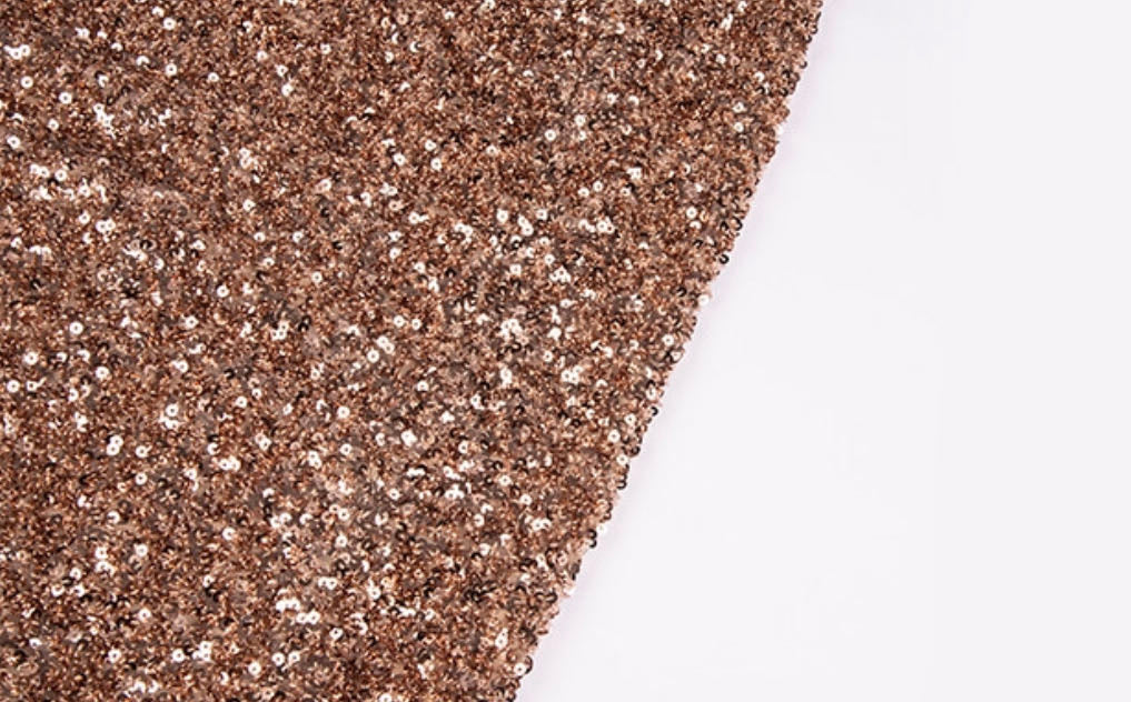 -Quality, mid weight brown fabric with sequins, non stretchy