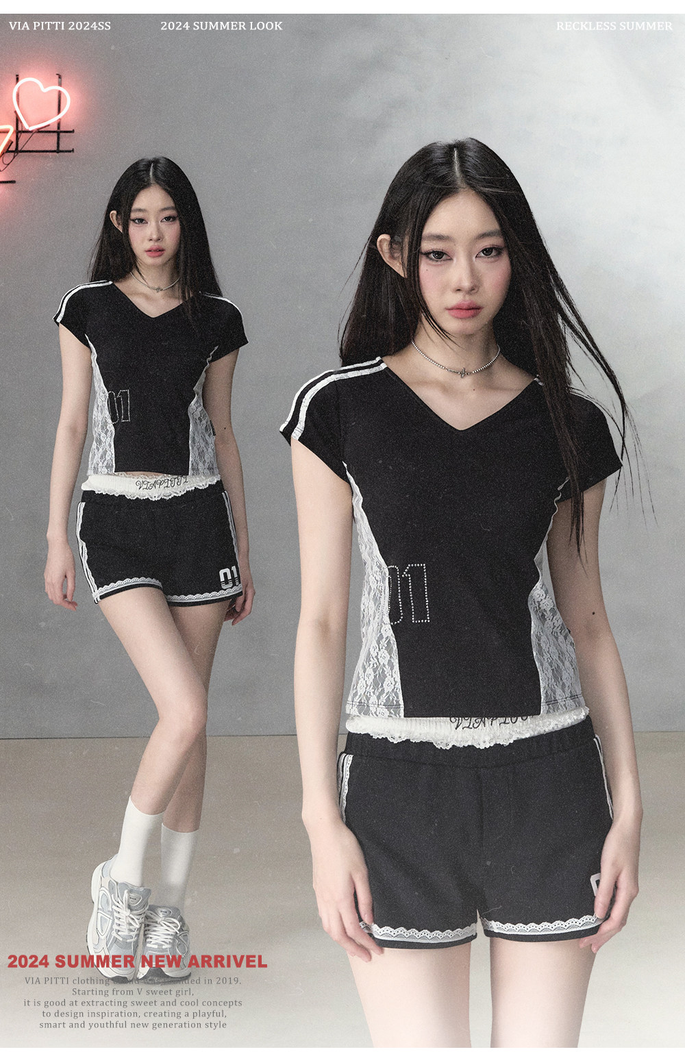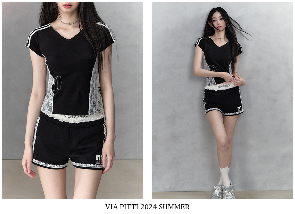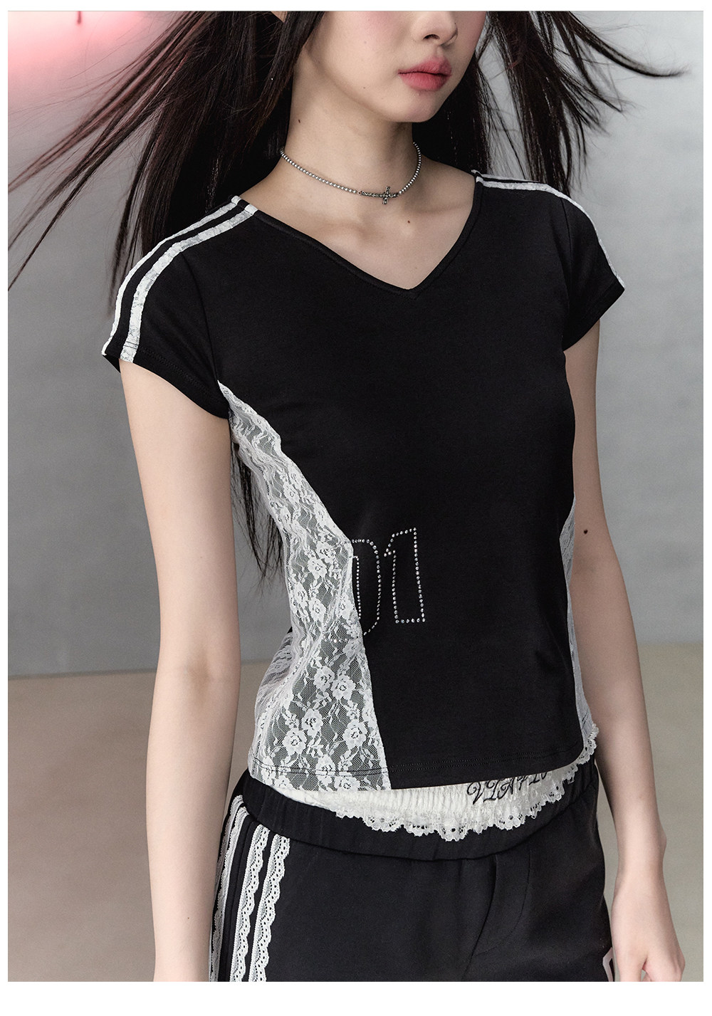Black Lace Trim with Letter Print Short Sleeves