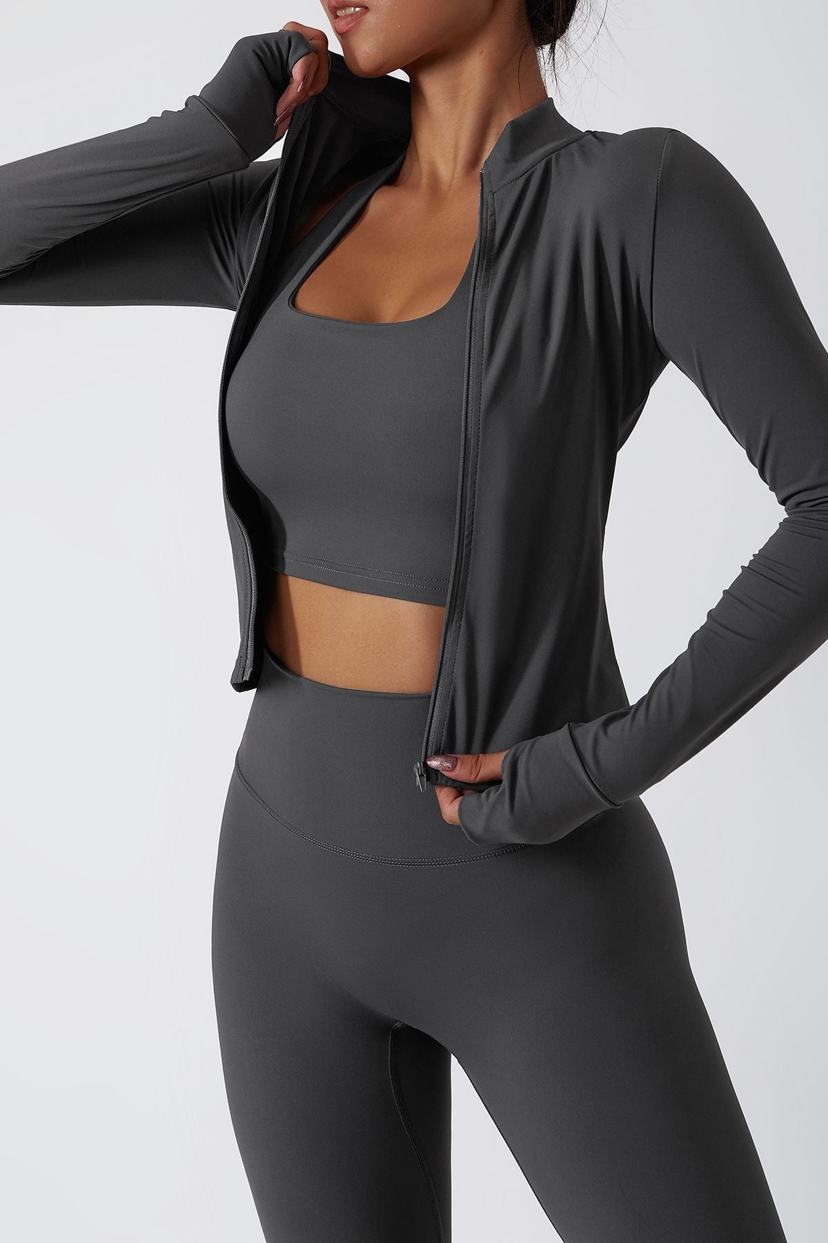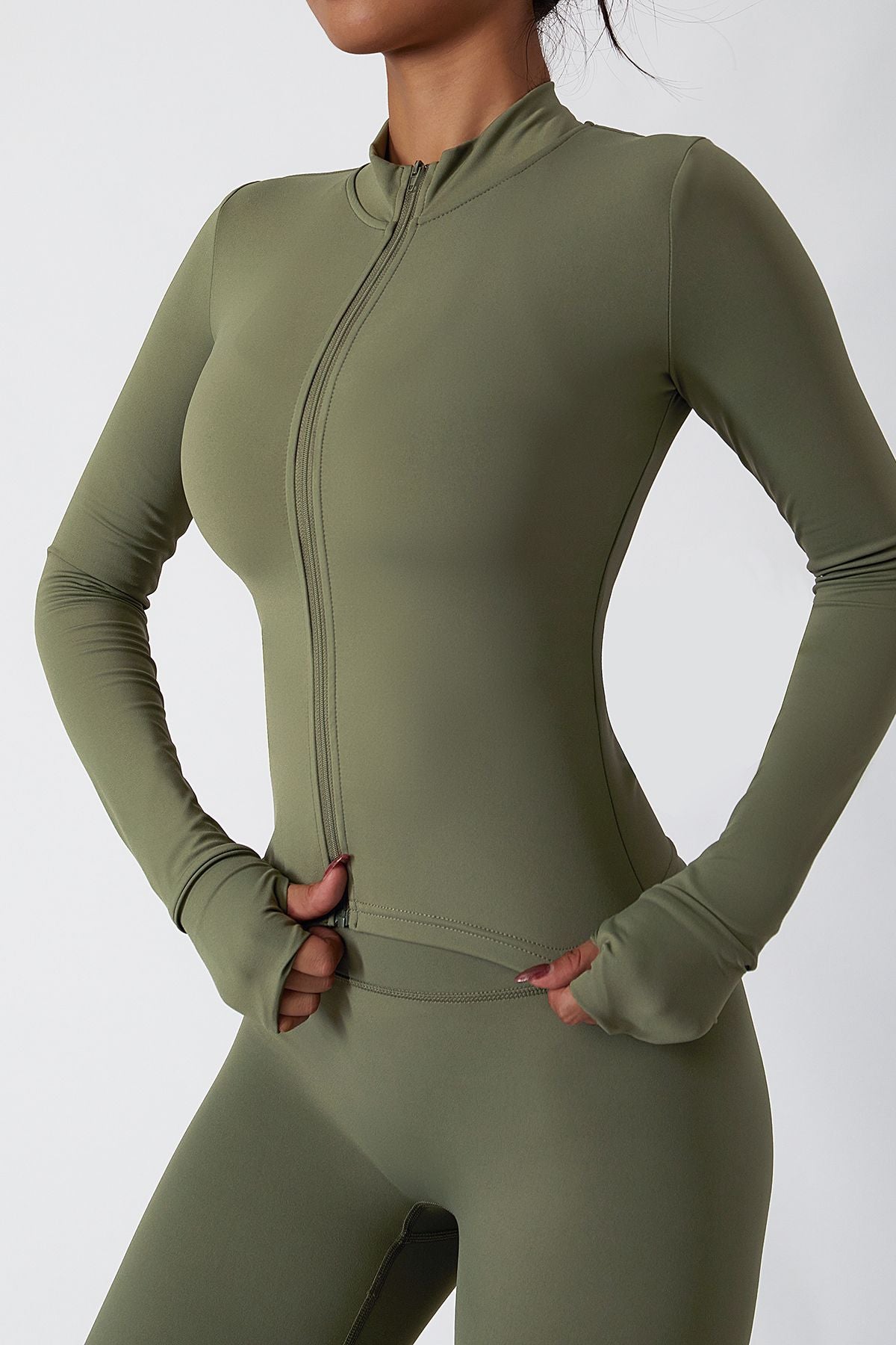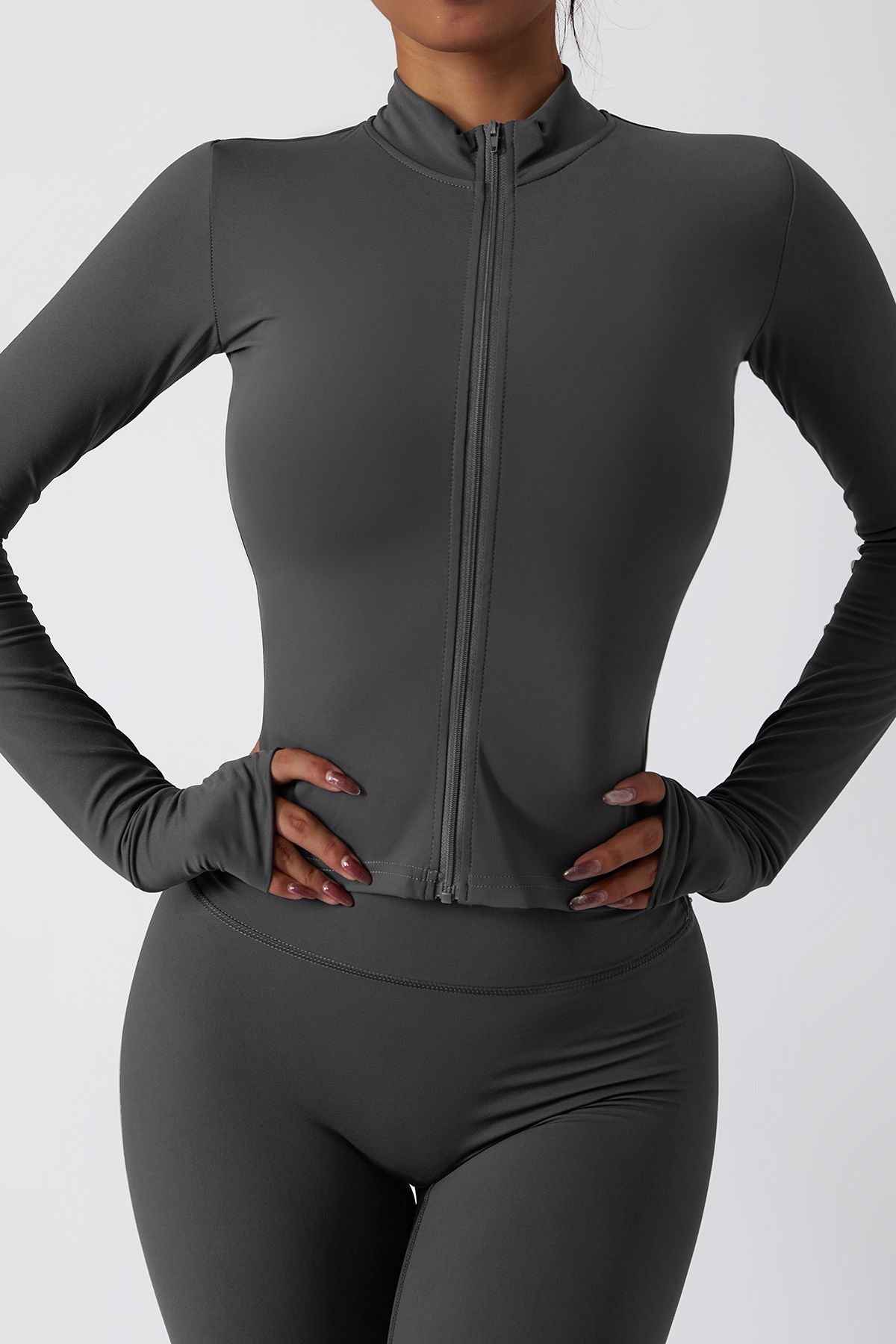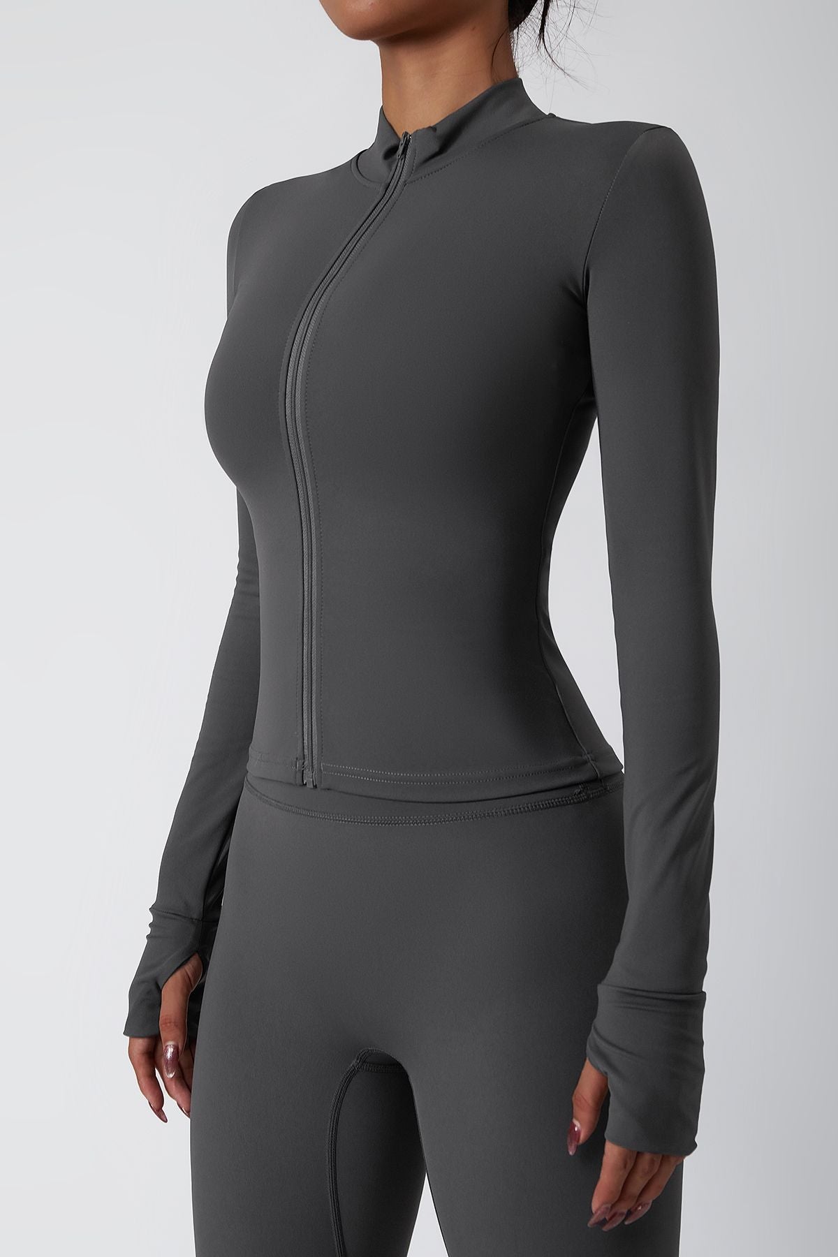 This jacket in naked sensation fabric. features soft curves that contour to the shape of your body to move with you as you stretch and flow. A full-length zipper offers as much coverage as you like. long sleeves with thumb holes design, give you hands more protection, and the stretchy knit fabric lends a soft, smooth feel for year-round wear.