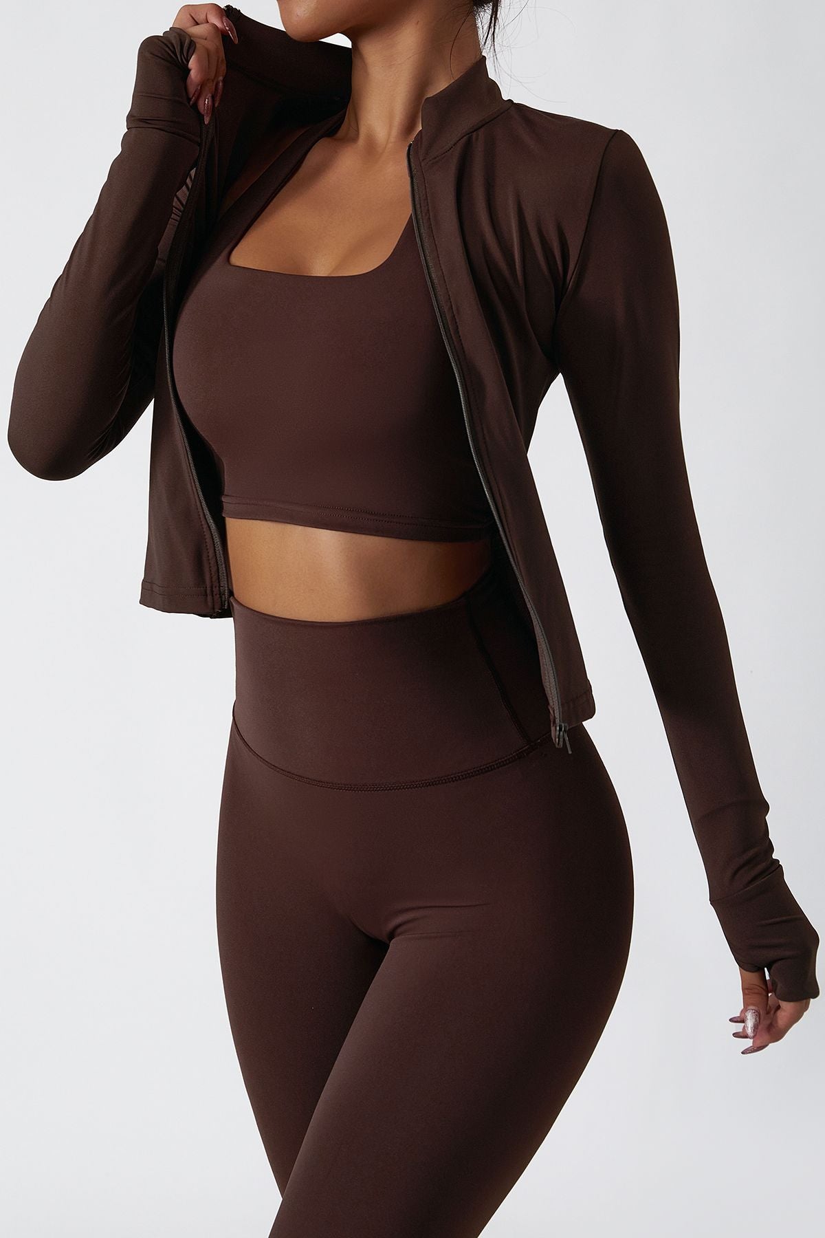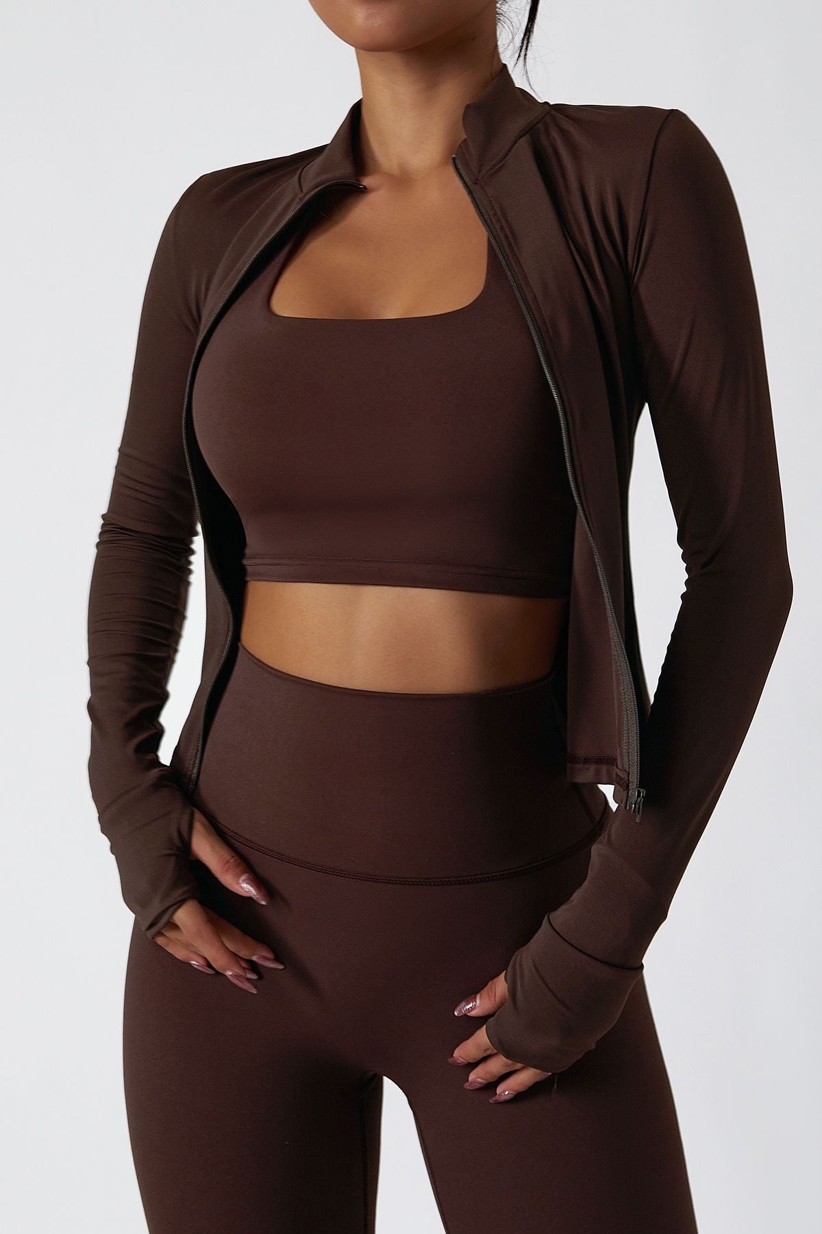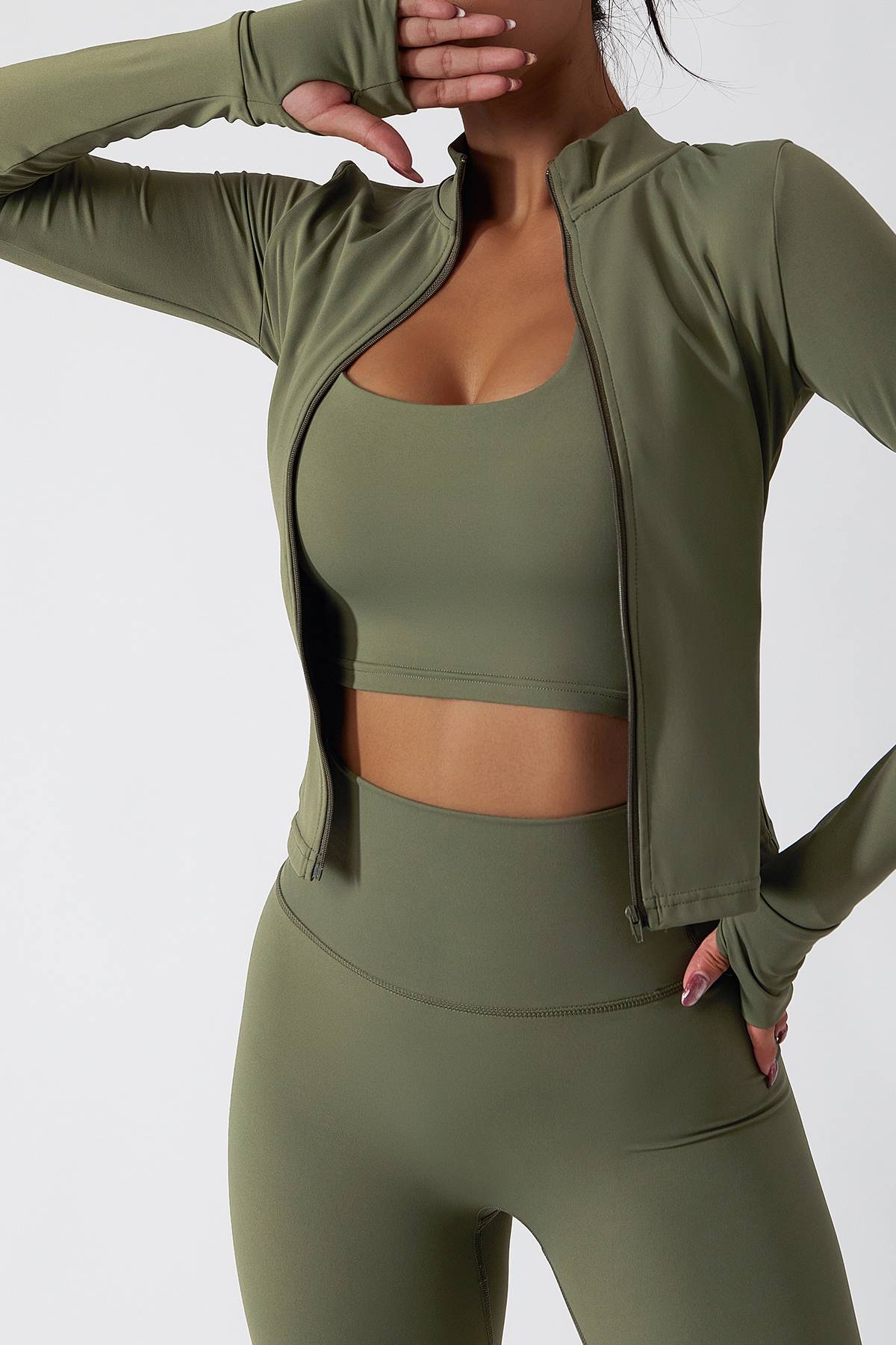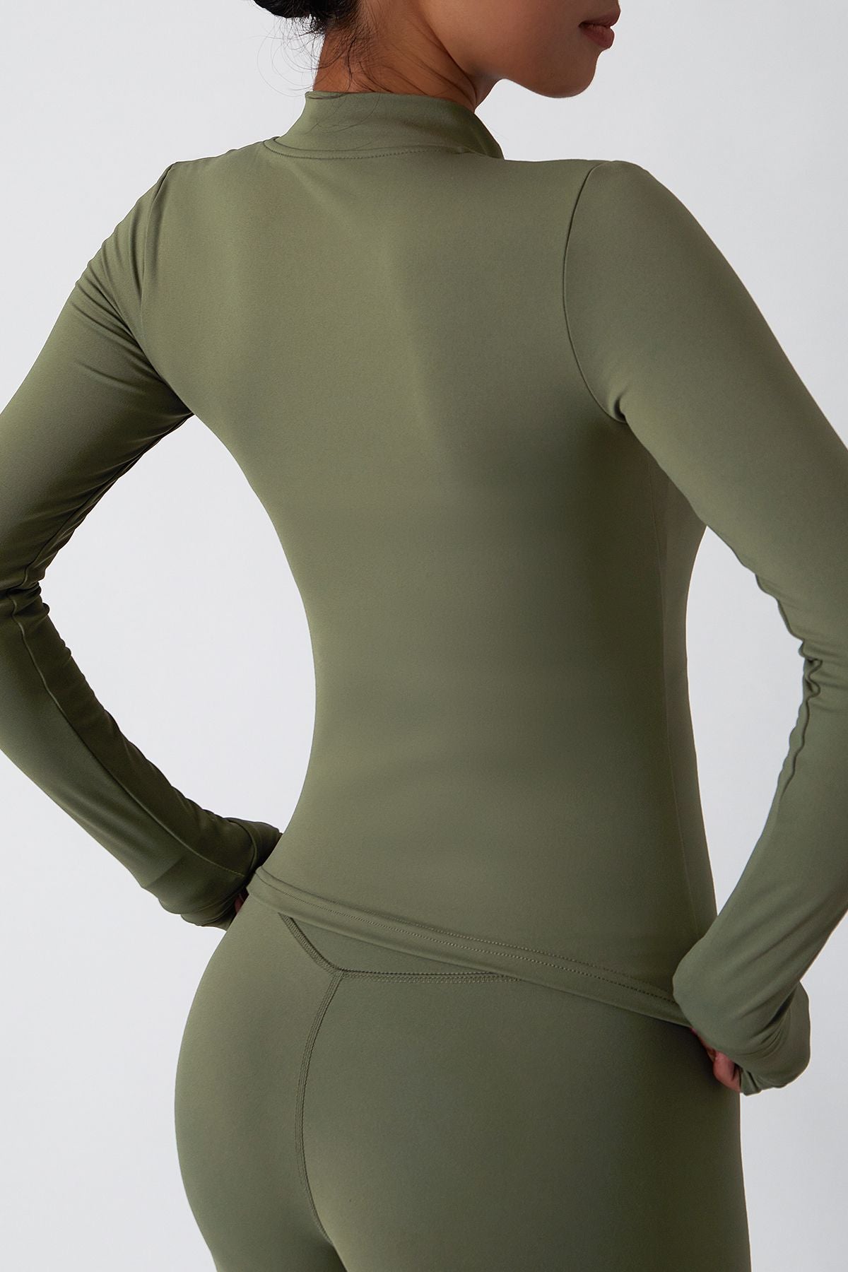 This jacket in naked sensation fabric. features soft curves that contour to the shape of your body to move with you as you stretch and flow. A full-length zipper offers as much coverage as you like. long sleeves with thumb holes design, give you hands more protection, and the stretchy knit fabric lends a soft, smooth feel for year-round wear.