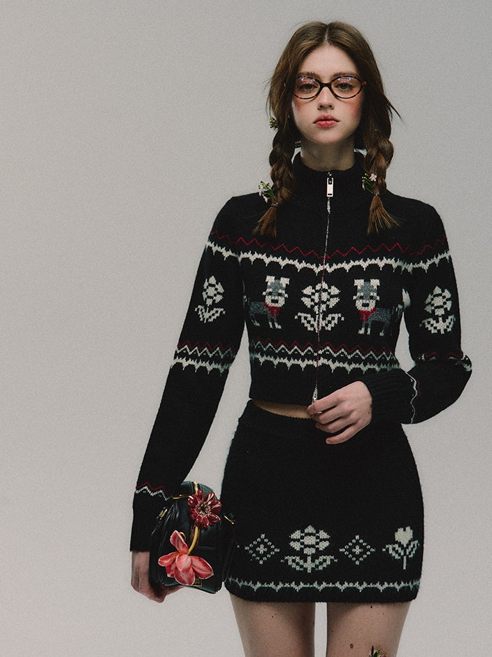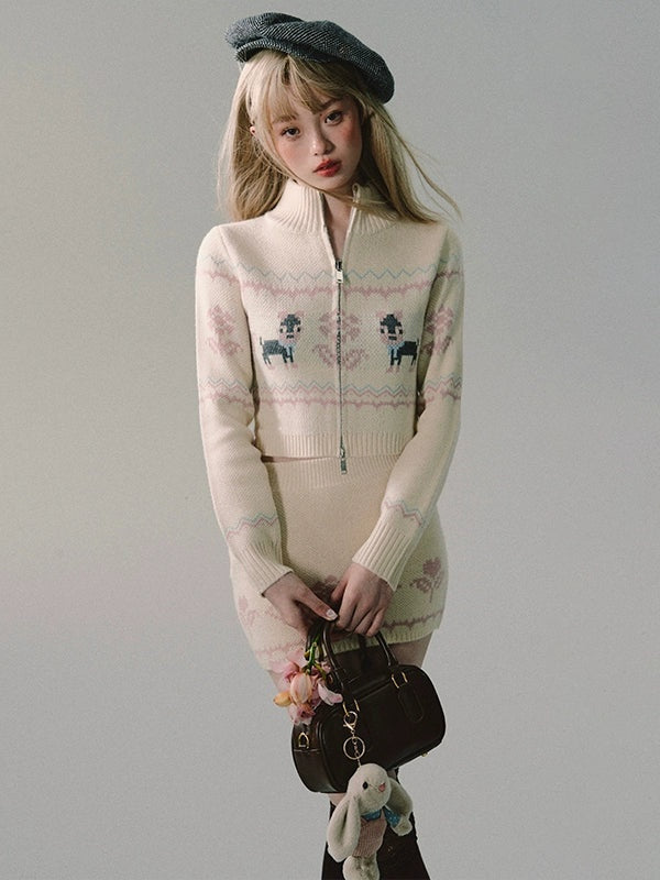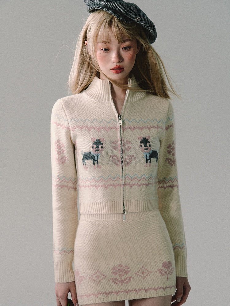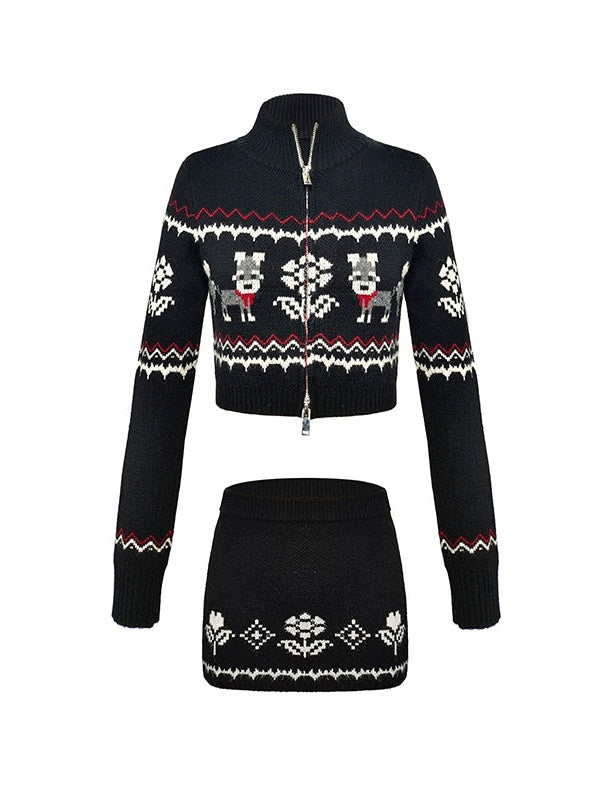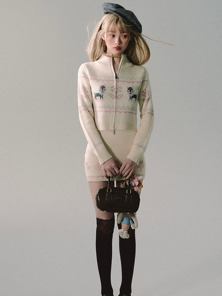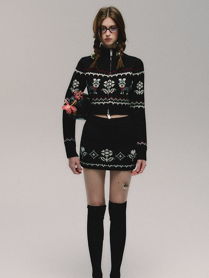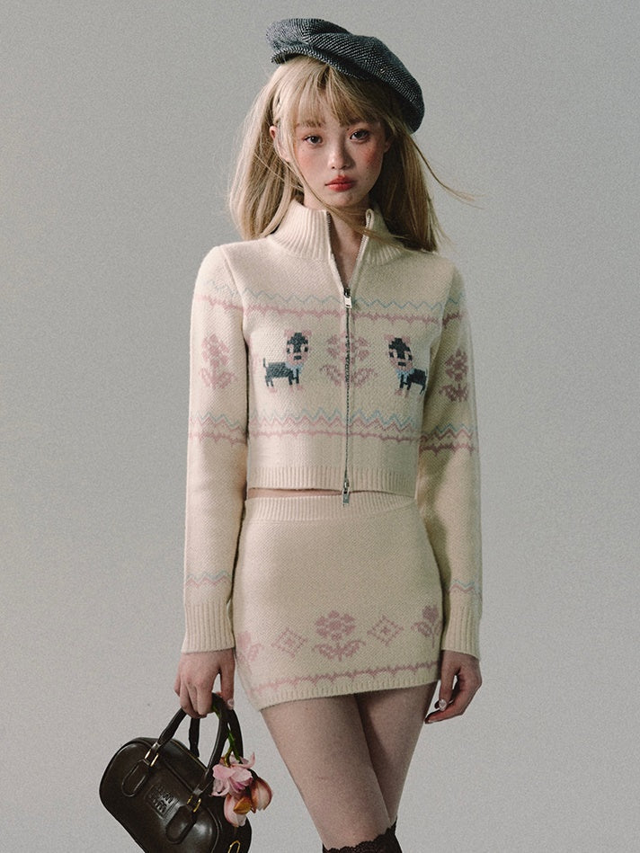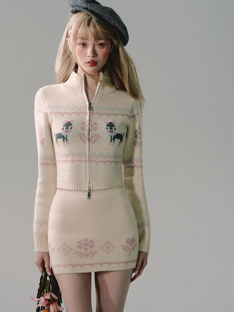 ZIP-Up Jacquard Knitted Stand-Collar Cardigan & Skirt
