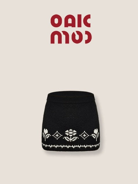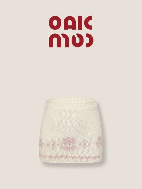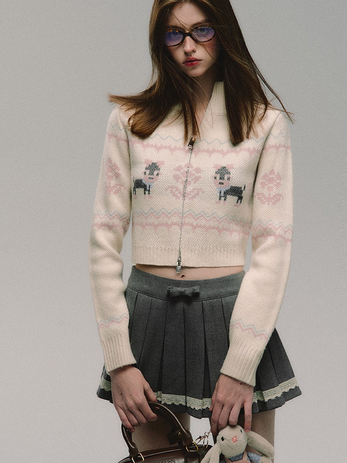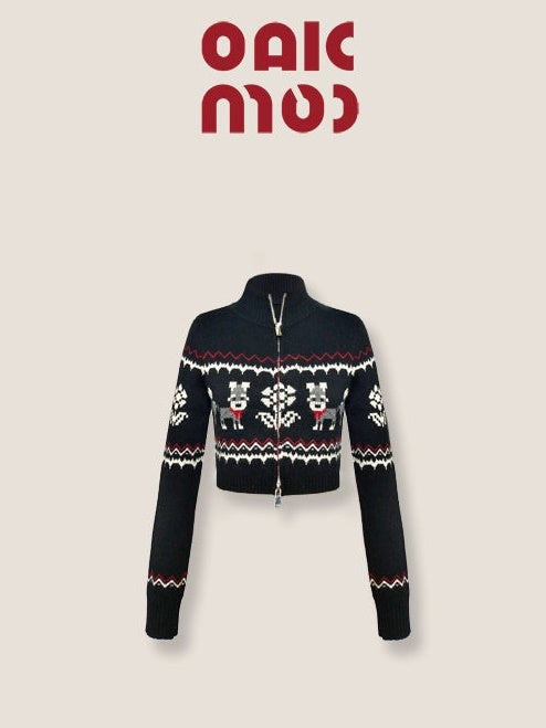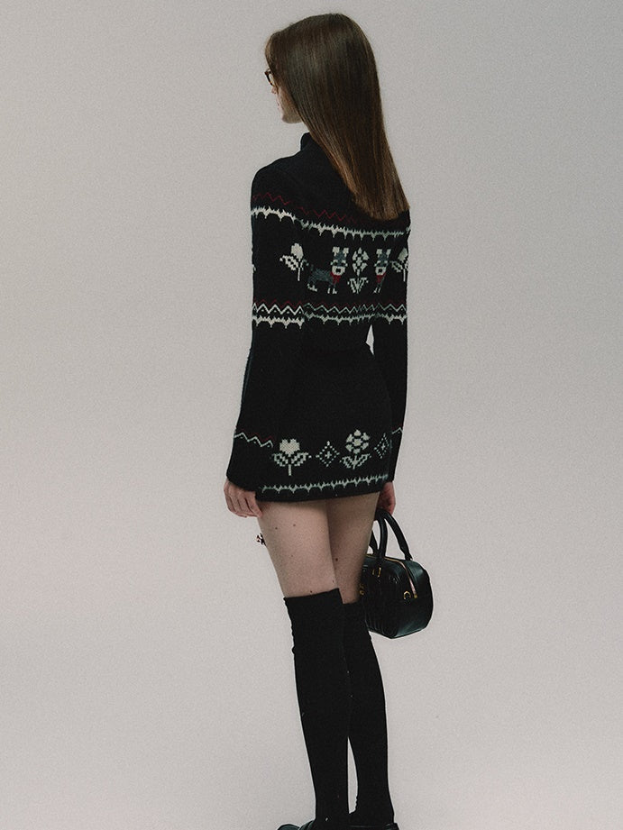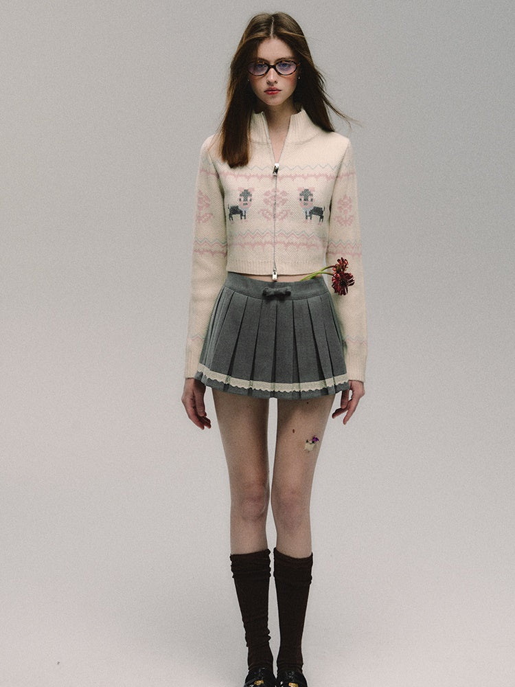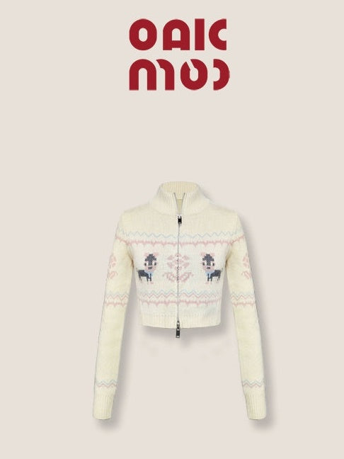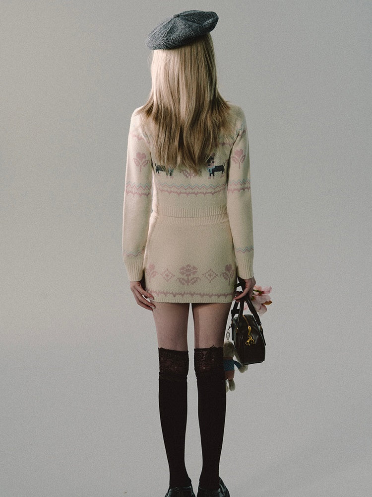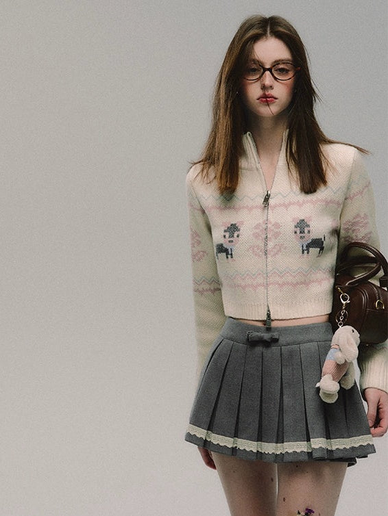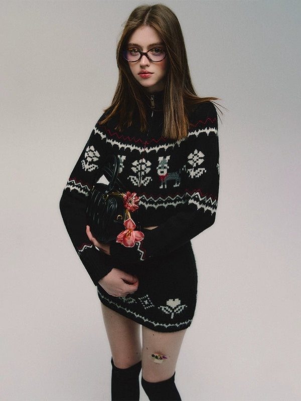 ZIP-Up Jacquard Knitted Stand-Collar Cardigan & Skirt